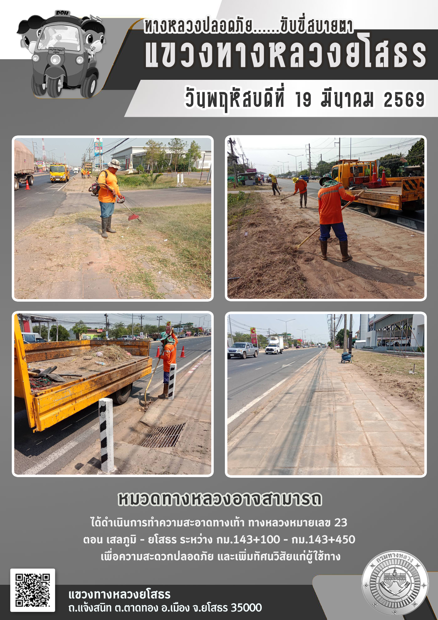วันพฤหัสบดีที่ 19 มีนาคม 2569 หมวดทางหลวงอาจสามารถ ได้ดำเนินการทำความสะอาดทางเท้า ทางหลวงหมายเลข 23 ตอน เสลภูมิ - ยโสธร ระหว่าง กม.143+100 - กม.143+450 เพื่อความสะดวกปลอดภัย และเพิ่มทัศนวิสัยแก่ผู้ใช้ทาง