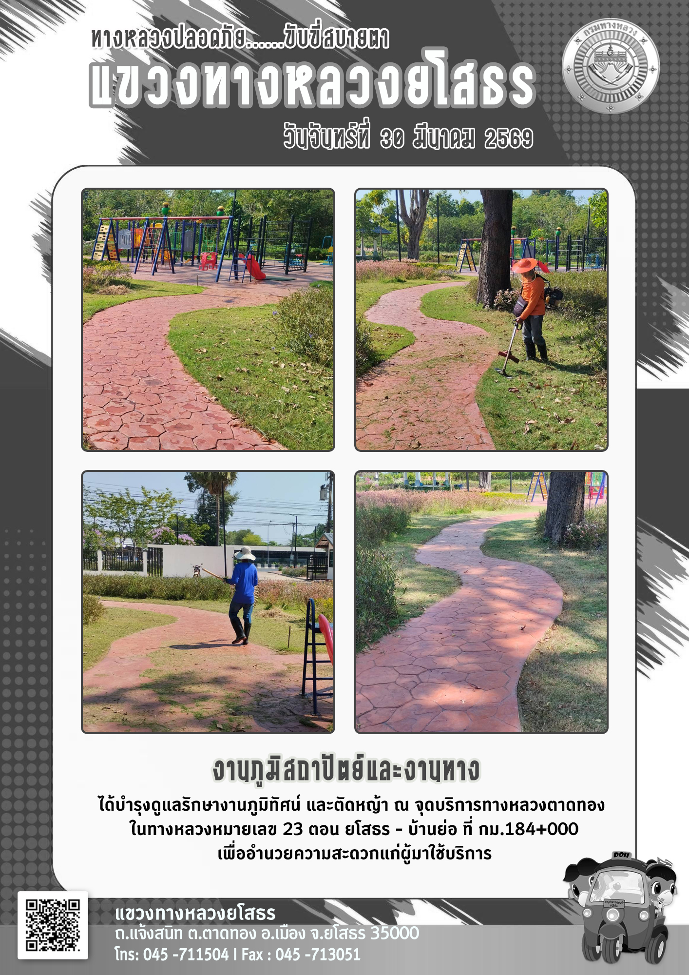วันจันทร์ที่ 30 มีนาคม 2569 งานภูมิสถาปัตย์และงานทาง ได้บำรุงดูแลรักษางานภูมิทัศน์ และตัดหญ้า ณ จุดบริการทางหลวงตาดทอง ในทางหลวงหมายเลข 23 ตอน ยโสธร - บ้านย่อ ที่ กม.184+000 เพื่ออำนวยความสะดวกแก่ผู้มาใช้บริการ