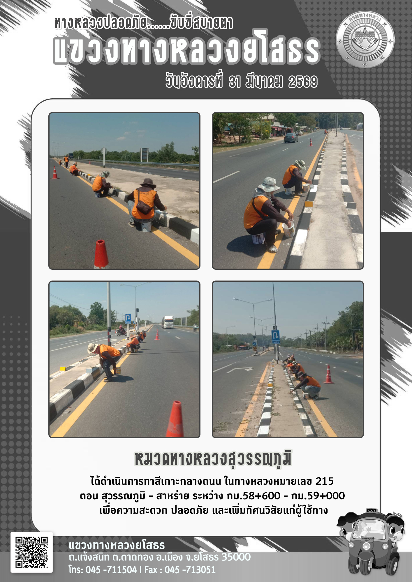 วันอังคารที่ 31 มีนาคม 2569 หมวดทางหลวงสุวรรณภูมิ ได้ดำเนินการทาสีเกาะกลางถนน ในทางหลวงหมายเลข 215 ตอน สุวรรณภูมิ - สาหร่าย ระหว่าง กม.58+600 - กม.59+000 เพื่อความสะดวก ปลอดภัย และเพิ่มทัศนวิสัยแก่ผู้ใช้ทาง