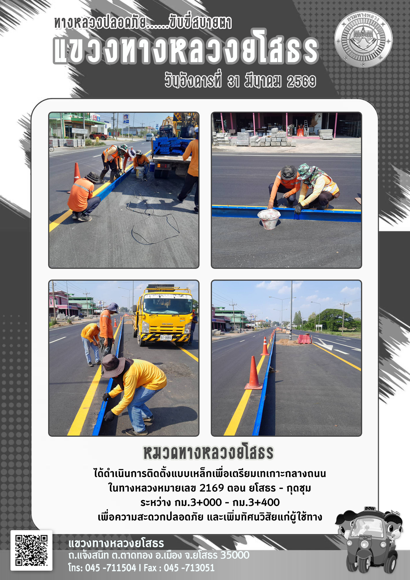 วันอังคารที่ 31 มีนาคม 2569 หมวดทางหลวงยโสธร ได้ดำเนินการติดตั้งแบบเหล็กเพื่อเตรียมเทเกาะกลางถนน ในทางหลวงหมายเลข 2169 ตอน ยโสธร - กุดชุม ระหว่าง กม.3+000 - กม.3+400 เพื่อความสะดวกปลอดภัย และเพิ่มทัศนวิสัยแก่ผู้ใช้ทาง