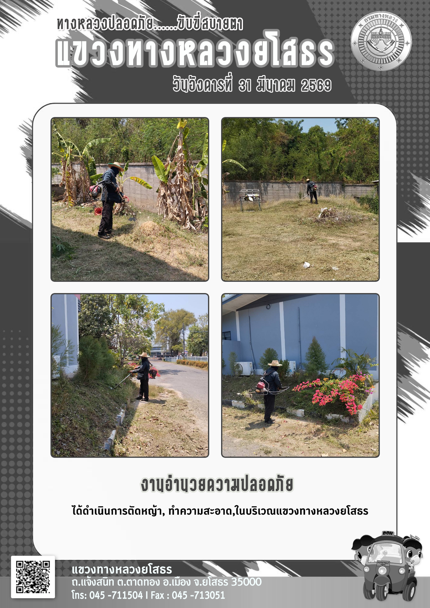 วันอังคารที่ 31 มีนาคม 2569 งานอำนวยความปลอดภัย ได้ดำเนินการตัดหญ้า ทำความสะอาดภายในบริเวณแขวงทางหลวงยโสธร