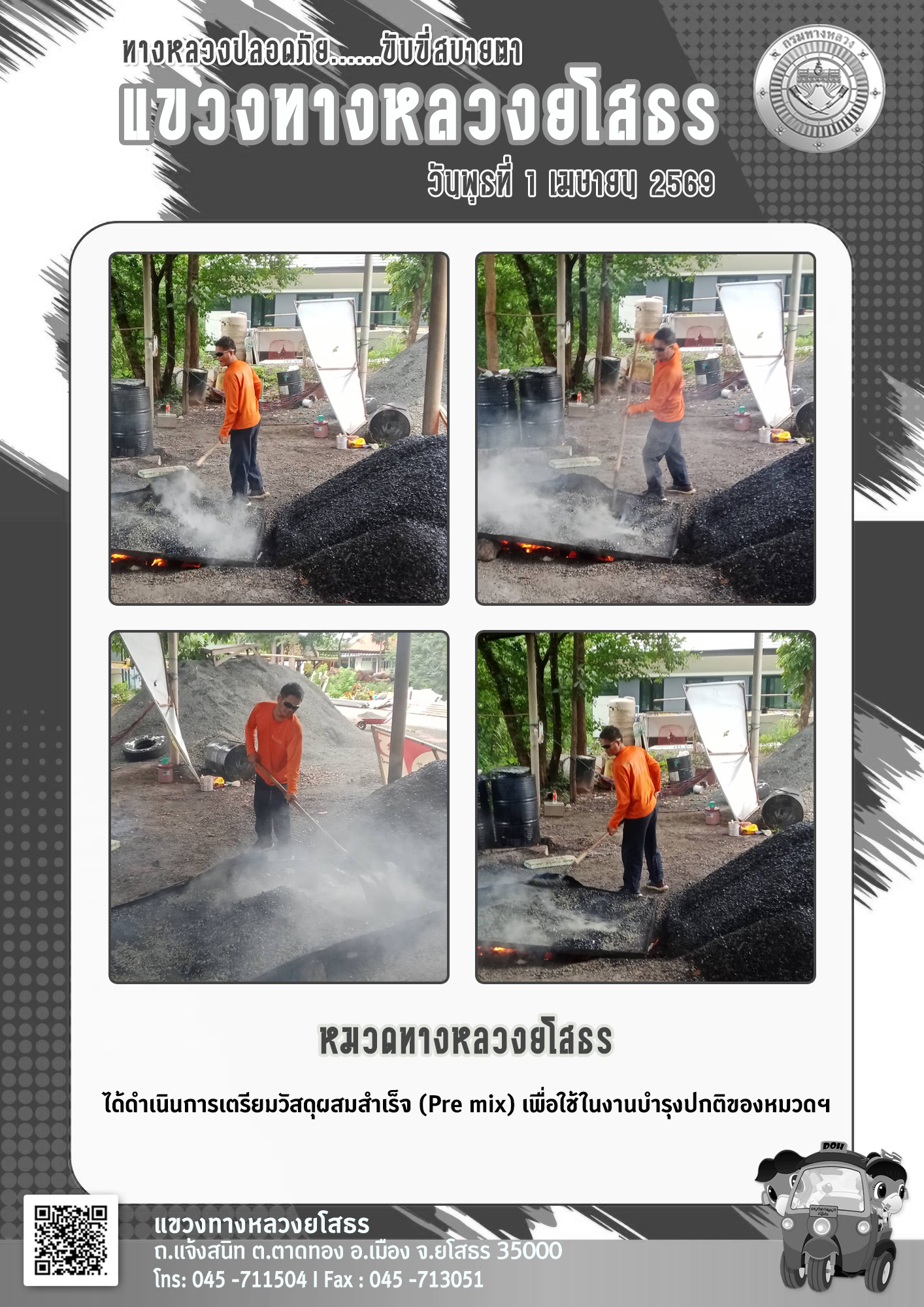 วันพุธที่ 1 เมษายน 2569 หมวดทางหลวงยโสธร ได้ดำเนินการเตรียมวัสดุผสมสำเร็จ (Pre mix) เพื่อใช้ในงานบำรุงปกติของหมวดฯ