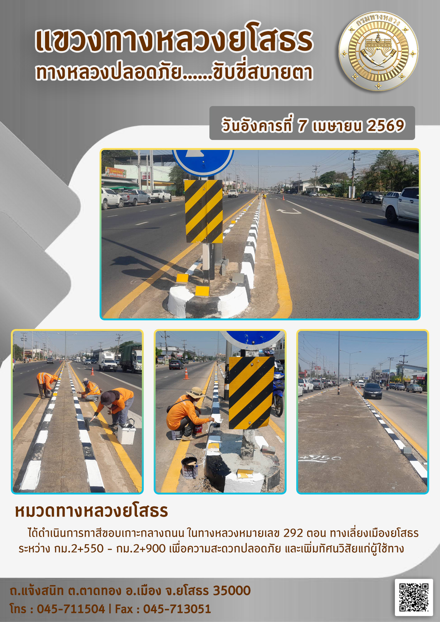 วันอังคารที่ 7 เมษายน 2569 หมวดทางหลวงยโสธร ได้ดำเนินการทาสีขอบเกาะกลางถนน ในทางหลวงหมายเลข 292 ตอน ทางเลี่ยงเมืองยโสธร ระหว่าง กม.2+550 - กม.2+900 เพื่อความสะดวกปลอดภัย และเพิ่มทัศนวิสัยแก่ผู้ใช้ทาง