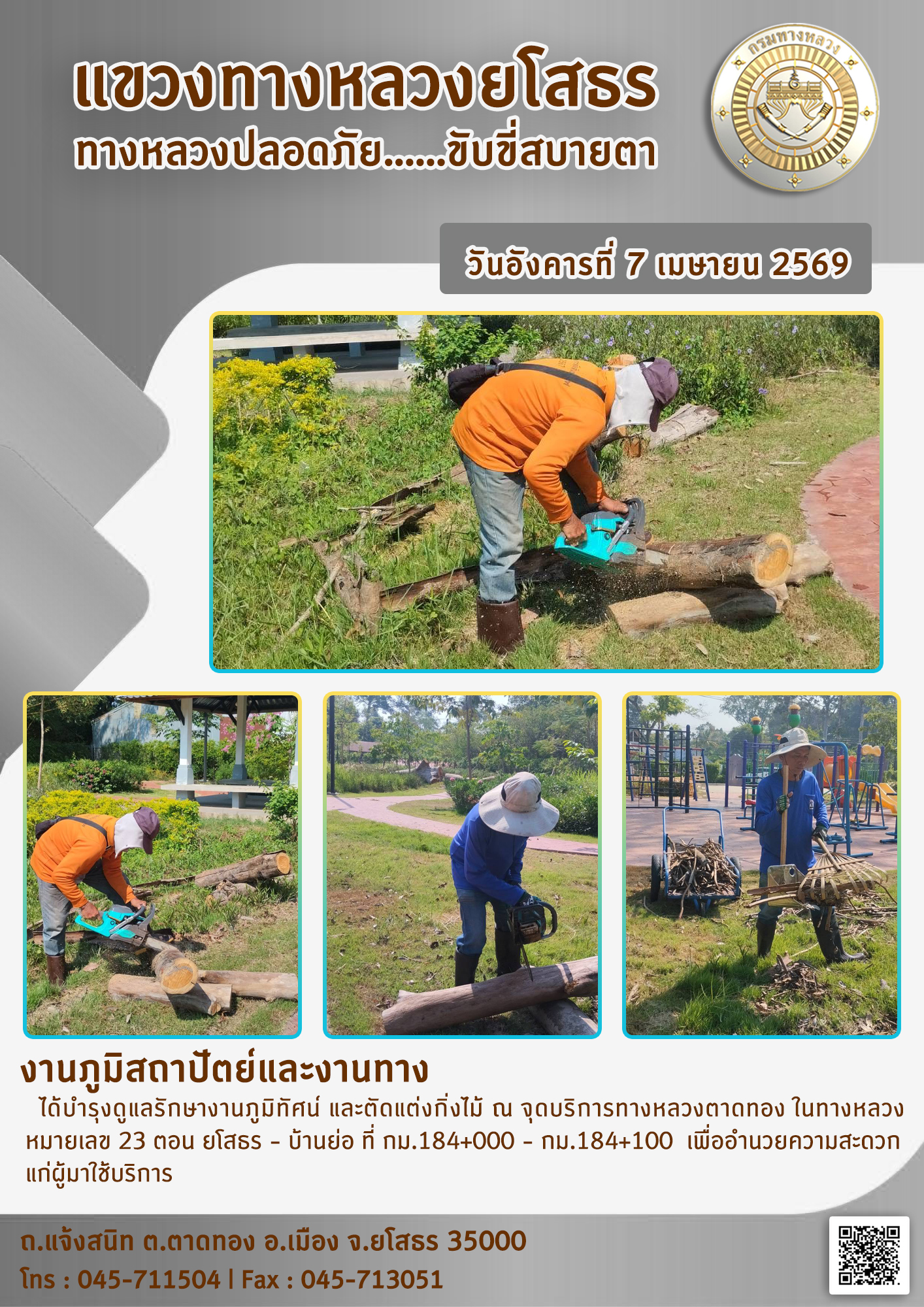 วันอังคารที่ 7 เมษายน 2569 งานภูมิสถาปัตย์และงานทาง ได้บำรุงดูแลรักษางานภูมิทัศน์ และตัดแต่งกิ่งไม้ ณ จุดบริการทางหลวงตาดทอง ในทางหลวงหมายเลข 23 ตอน ยโสธร - บ้านย่อ ที่ กม.184+000 - กม.184+100 เพื่ออำนวยความสะดวก แก่ผู้มาใช้บริการ
