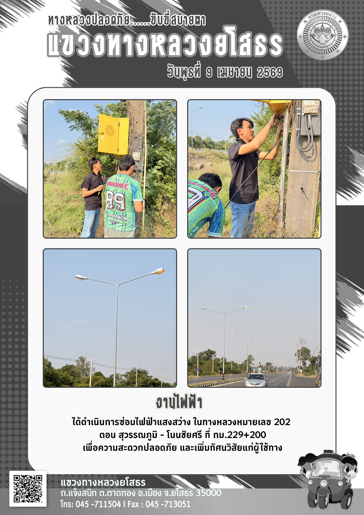 วันพุธที่ 9 เมษายน 2569 งานไฟฟ้า ได้ดำเนินการซ่อมไฟฟ้าแสงสว่าง ในทางหลวงหมายเลข 202 ตอน สุวรรณภูมิ - โนนชัยศรี ที่ กม.229+200 เพื่อความสะดวกปลอดภัย และเพิ่มทัศนวิสัยแก่ผู้ใช้ทาง