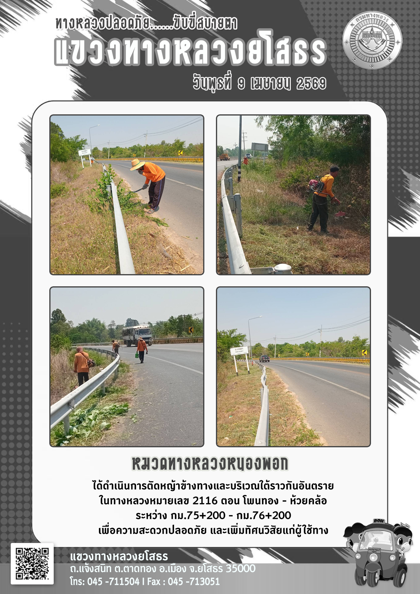 วันพุธที่ 9 เมษายน 2569 หมวดทางหลวงหนองพอก ได้ดำเนินการตัดหญ้าข้างทางและบริเวณใต้ราวกันอันตราย ในทางหลวงหมายเลข 2116 ตอน โพนทอง - ห้วยคล้อ ระหว่าง กม.75+200 - กม.76+200 เพื่อความสะดวกปลอดภัย และเพิ่มทัศนวิสัยแก่ผู้ใช้ทาง