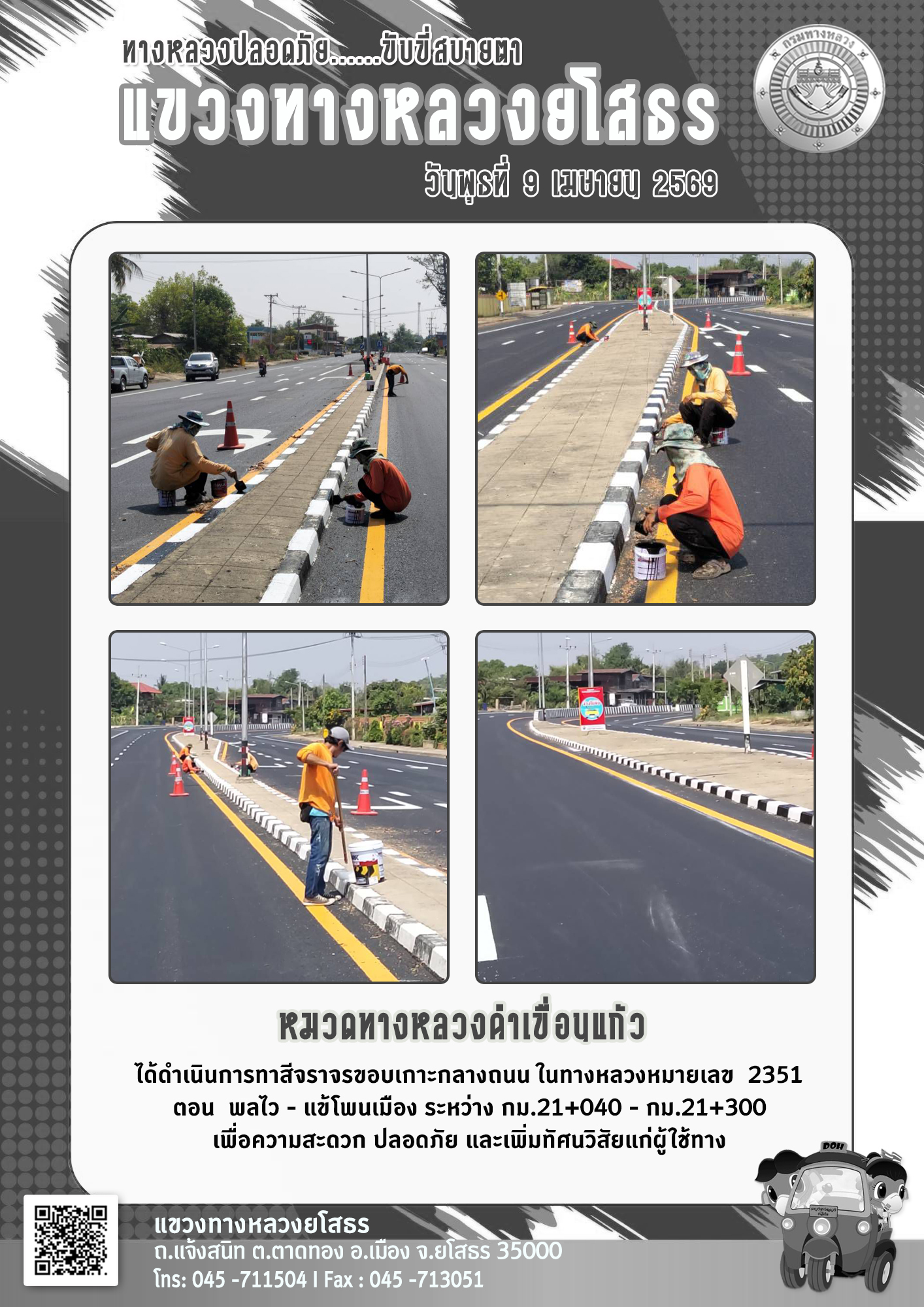 - [11:47] ทั่วไป วันพุธที่ 9 เมษายน 2569 หมวดทางหลวงยโสธร ได้ดำเนินการทาสีขอบเกาะกลางถนน ในทางหลวงหมายเลข 292 ตอน ทางเลี่ยงเมืองยโสธร ระหว่าง กม.1+900 - กม.2+000 และทางหลวงหมายเลข 2169 ตอน ยโสรร - กุดชุม ระหว่าง กม.2+450 - กม.2+550 เพื่อความสะดวกปลอดภัย