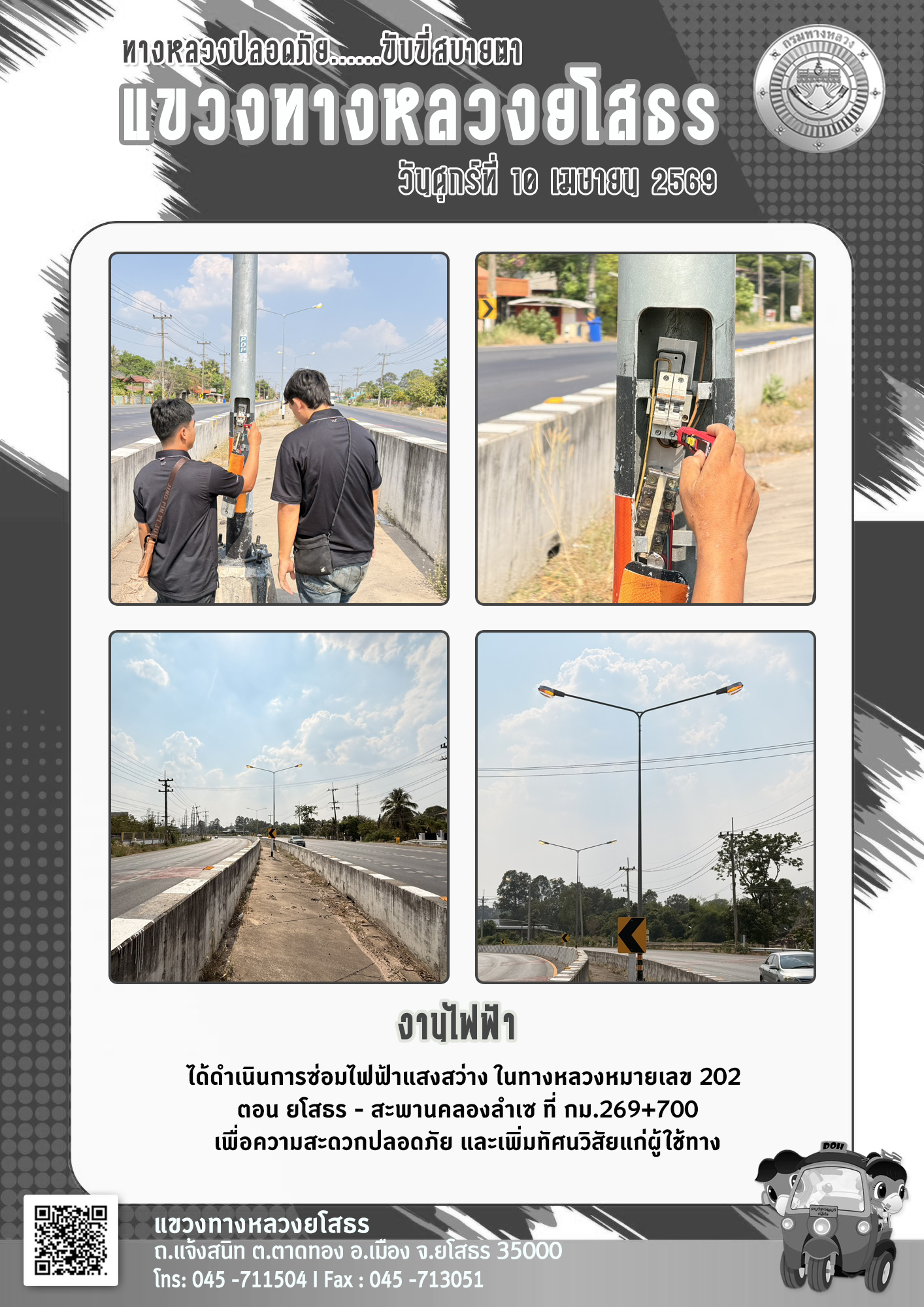 วันศุกร์ที่ 10 เมษายน 2569 งานไฟฟ้า ได้ดำเนินการซ่อมไฟฟ้าแสงสว่าง ในทางหลวงหมายเลข 202 ตอน ยโสรร - สะพานคลองลำเซ ที่ กม.269+700 เพื่อความสะดวกปลอดภัย และเพิ่มทัศนวิสัยแก่ผู้ใช้ทาง