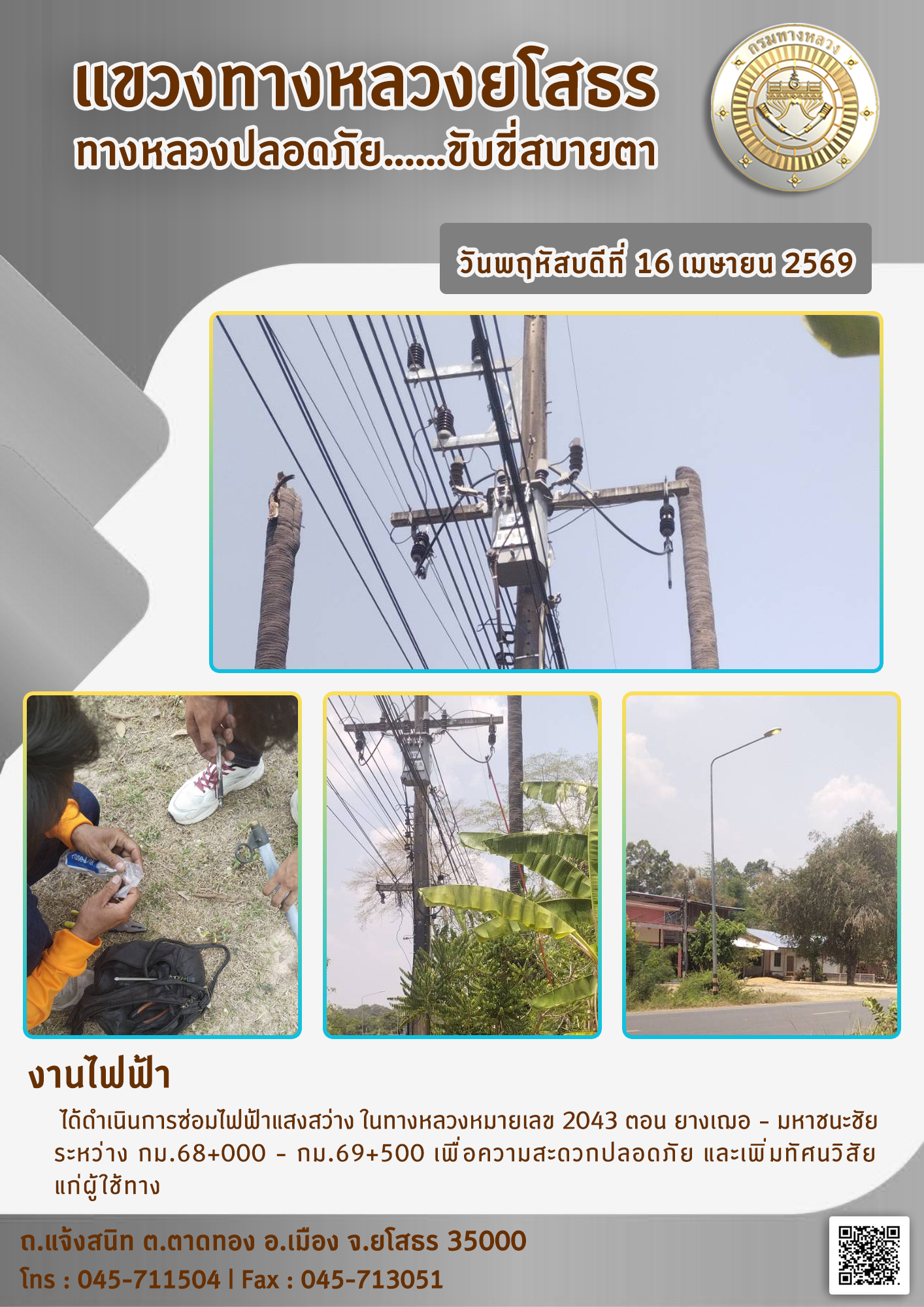 วันพฤหัสบดีที่ 16 เมษายน 2569 งานไฟฟ้า ได้ดำเนินการซ่อมไฟฟ้าแสงสว่าง ในทางหลวงหมายเลข 2043 ตอน ยางเฌอ - มหาชนะชัย ระหว่าง กม.68+000 - กม.69+500 เพื่อความสะดวกปลอดภัย และเพิ่มทัศนวิสัยแก่ผู้ใช้ทาง