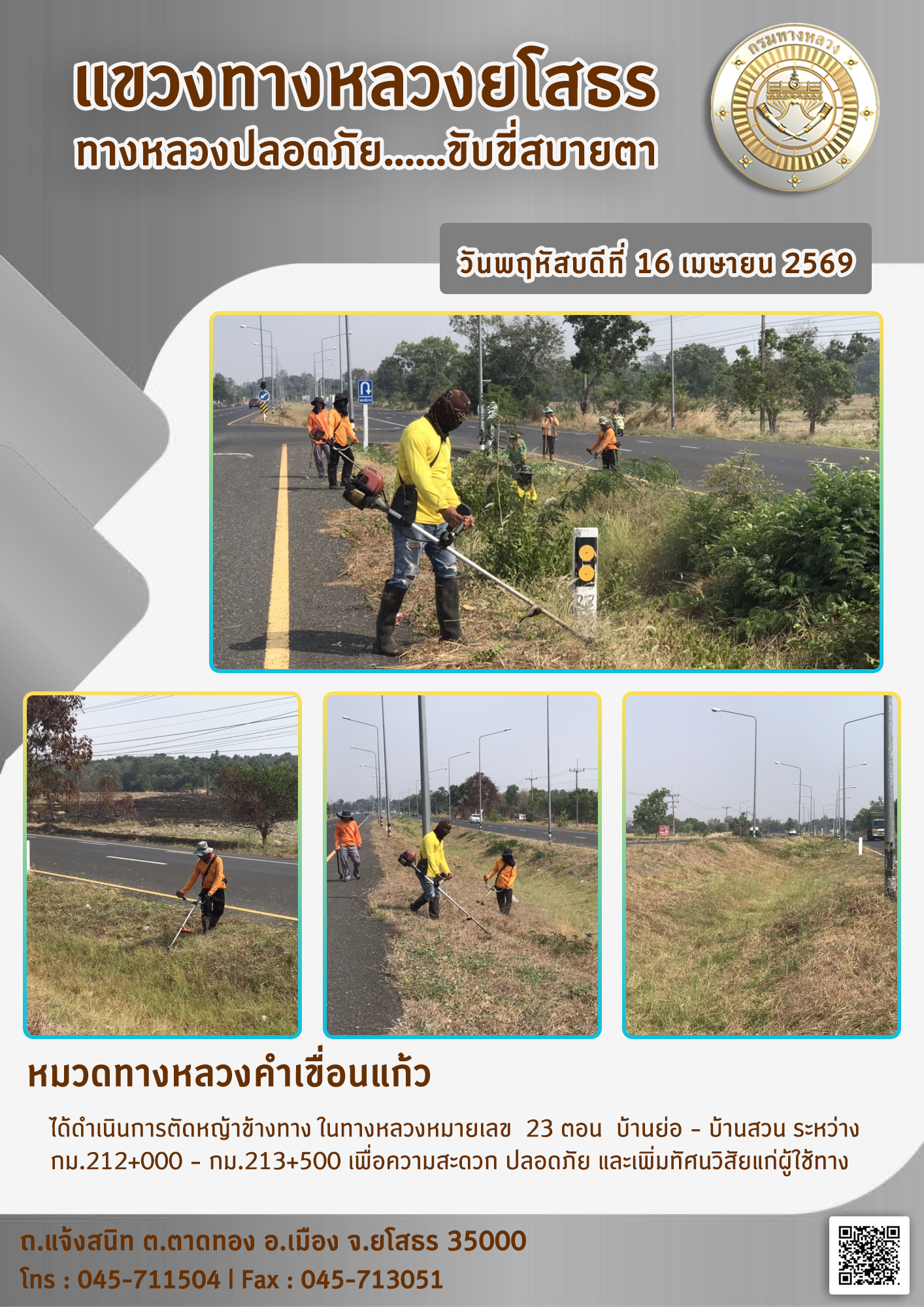 - [15:29] ทั่วไป วันจันทร์ที่ 20 เมษายน 2569 งานอำนวยความปลอดภัย ได้ดำเนินการตัดหญ้า, ทำความสะอาดในบริเวณแขวงทางหลวงยโสธร