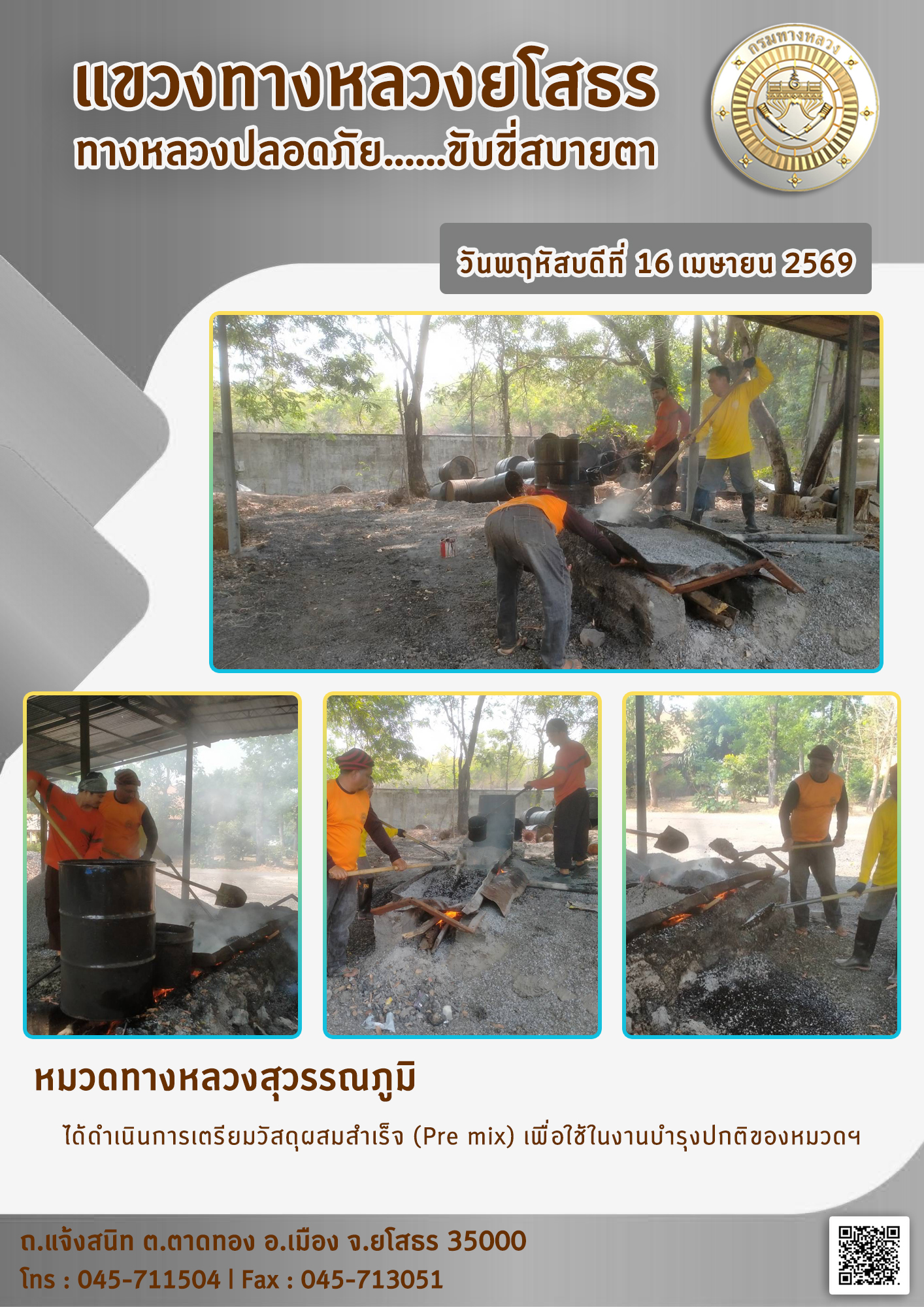 วันพฤหัสบดีที่ 16 เมษายน 2569 หมวดทางหลวงสุวรรณภูมิ ได้ดำเนินการเตรียมวัสดุผสมสำเร็จ (Pre mix) เพื่อใช้ในงานบำรุงปกติของหมวดฯ
