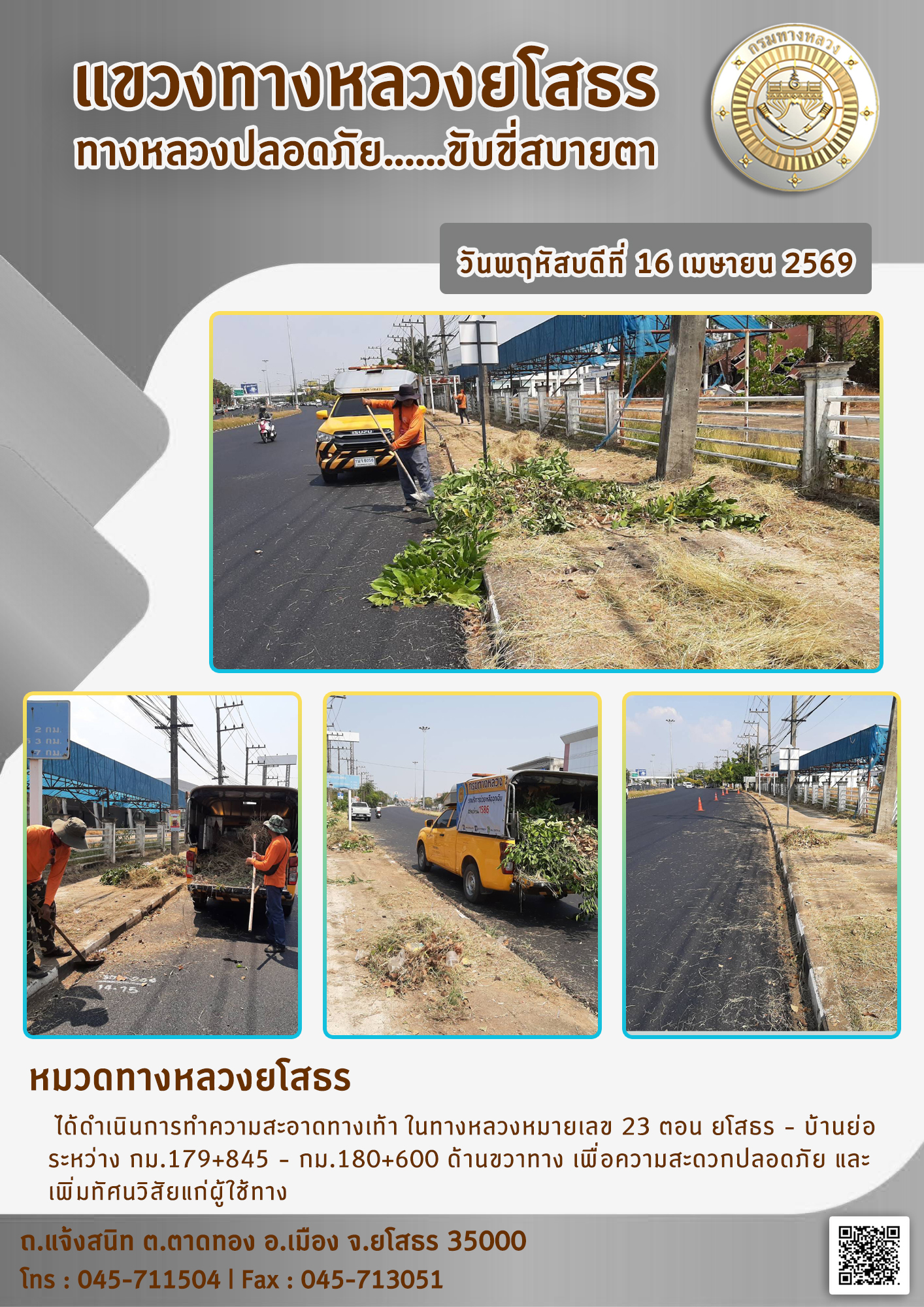 วันพฤหัสบดีที่ 16 เมษายน 2569 หมวดทางหลวงยโสธร ได้ดำเนินการทำความสะอาดทางเท้า ในทางหลวงหมายเลข 23 ตอน ยโสธร - บ้านย่อ ระหว่าง กม.179+845 - กม.180+600 ด้านขวาทาง เพื่อความสะดวกปลอดภัย และเพิ่มทัศนวิสัยแก่ผู้ใช้ทาง