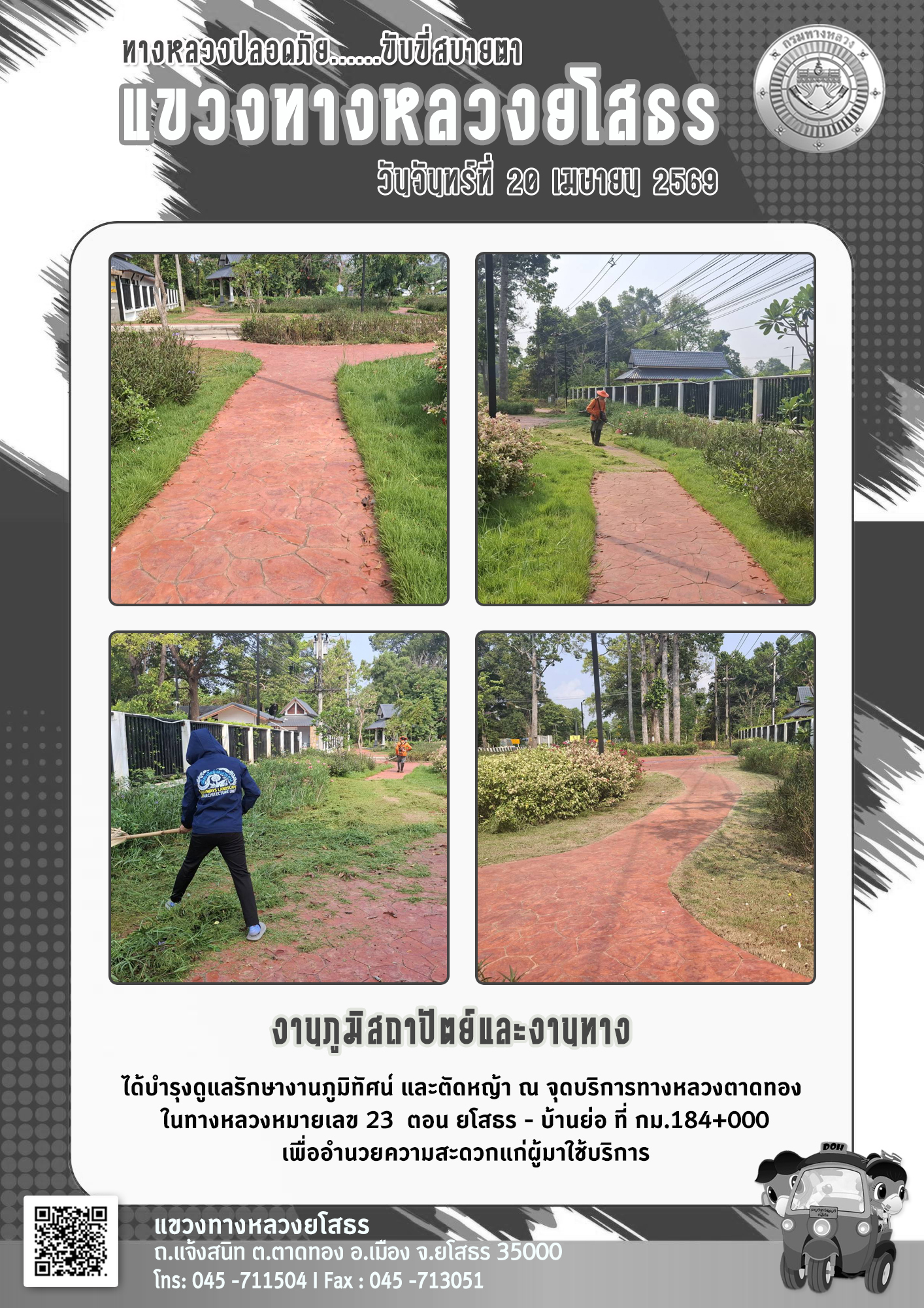 - [15:29] ทั่วไป วันจันทร์ที่ 20 เมษายน 2569 งานอำนวยความปลอดภัย ได้ดำเนินการตัดหญ้า, ทำความสะอาดในบริเวณแขวงทางหลวงยโสธร