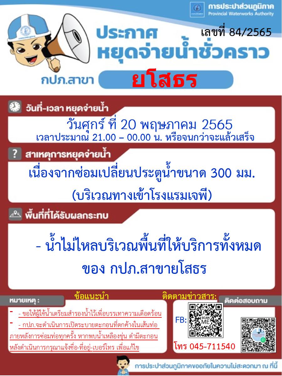 กปภ.สาขายโสธร ประกาศหยุดจ่ายน้ำเนื่องจากหยุดจ่ายน้ำชั่วคราว วันศุกร์ ที่ 20 พฤษภาคม 2565 เวลาประมาณ 21.00-00.00 น. หรือจนกว่าจะแล้วเสร็จ
