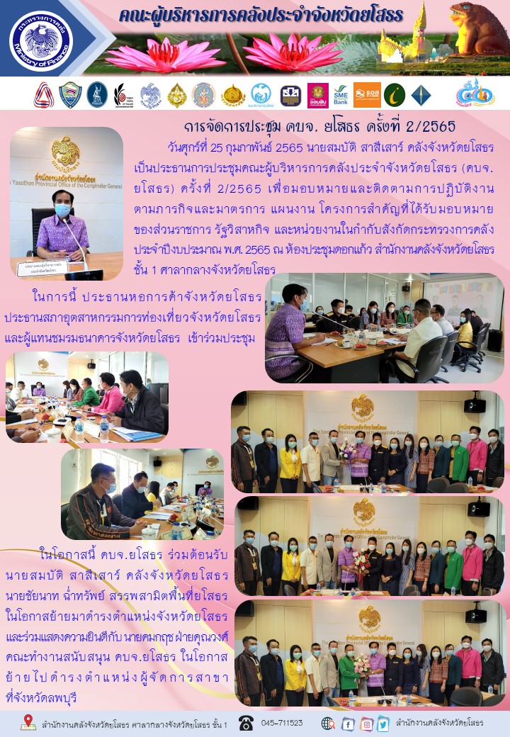 วันศุกร์ที่ 25 กุมภาพันธ์ 2565 นายสมบัติ สาสีเสาร์ คลังจังหวัดยโสธร เป็นประธานการประชุมคณะผู้บริหารการคลังประจำจังหวัดยโสธร (คบจ.ยโสธร) ครั้งที่ 2/2565 เพื่อมอบหมายและติดตามการปฏิบัติงานตามภารกิจและมาตรการ แผนงาน โครงการสำคัญที่ได้รับมอบหมายของส่วนรา