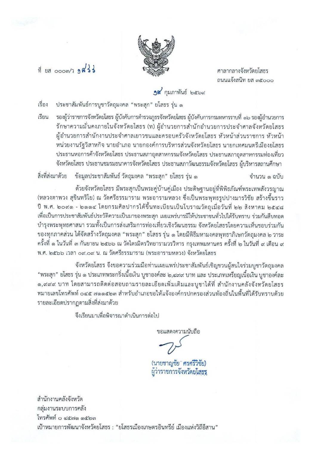 - [16:49] ทั่วไป สืบสานบารมี "พระสุก" พระคู่บ้านคู่เมืองชาวยโสธร ... โอกาสแห่งความเป็นสิริมงคล ✨ ร่วมบูชาวัตถุมงคล "พระสุก" ยโสธร รุ่น 1 พระพุทธรูปศักดิ์สิทธิ์ปางมารวิชัย ที่มีประวัติยาวนานกว่า 400 ปี (พ.ศ. 2091 - 2114) ซึ่งกรมศิลปากร ได้ขึ้น