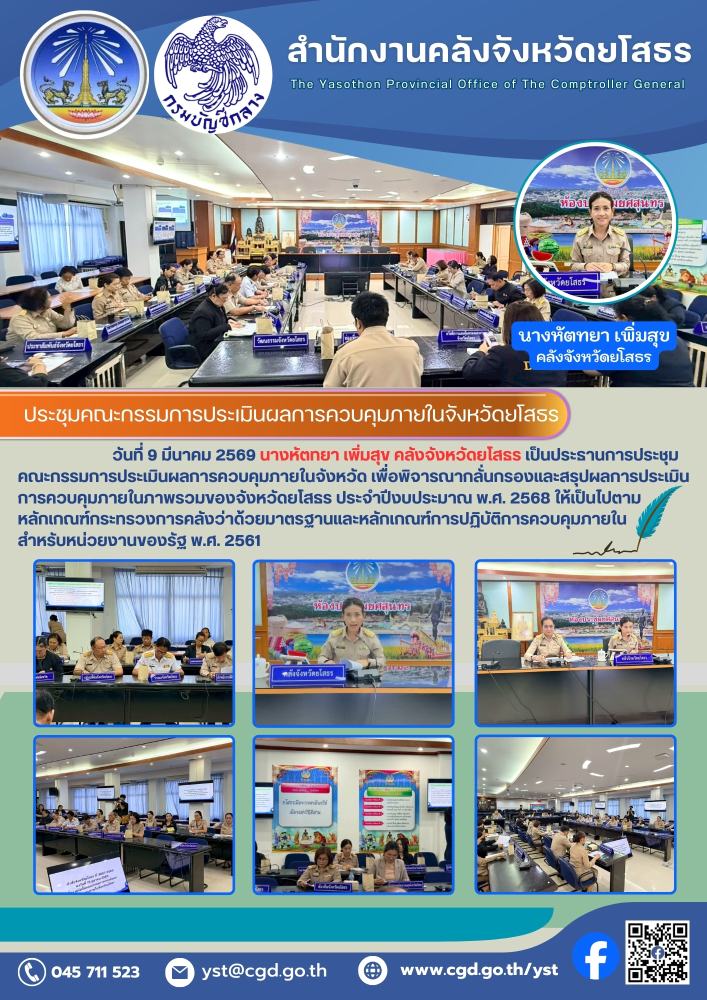 วันที่ 9 มีนาคม 2569 นางหัตทยา เพิ่มสุข คลังจังหวัดยโสธร เป็นประธานการประชุมคณะกรรมการประเมินผลการควบคุมภายในจังหวัด เพื่อพิจารณากลั่นกรองและสรุปผลการประเมินการควบคุมภายในภาพรวมของจังหวัดยโสธร ประจำปีงบประมาณ พ.ศ. 2568 ให้เป็นไปตามหลักเกณฑ์กระทรวงการ