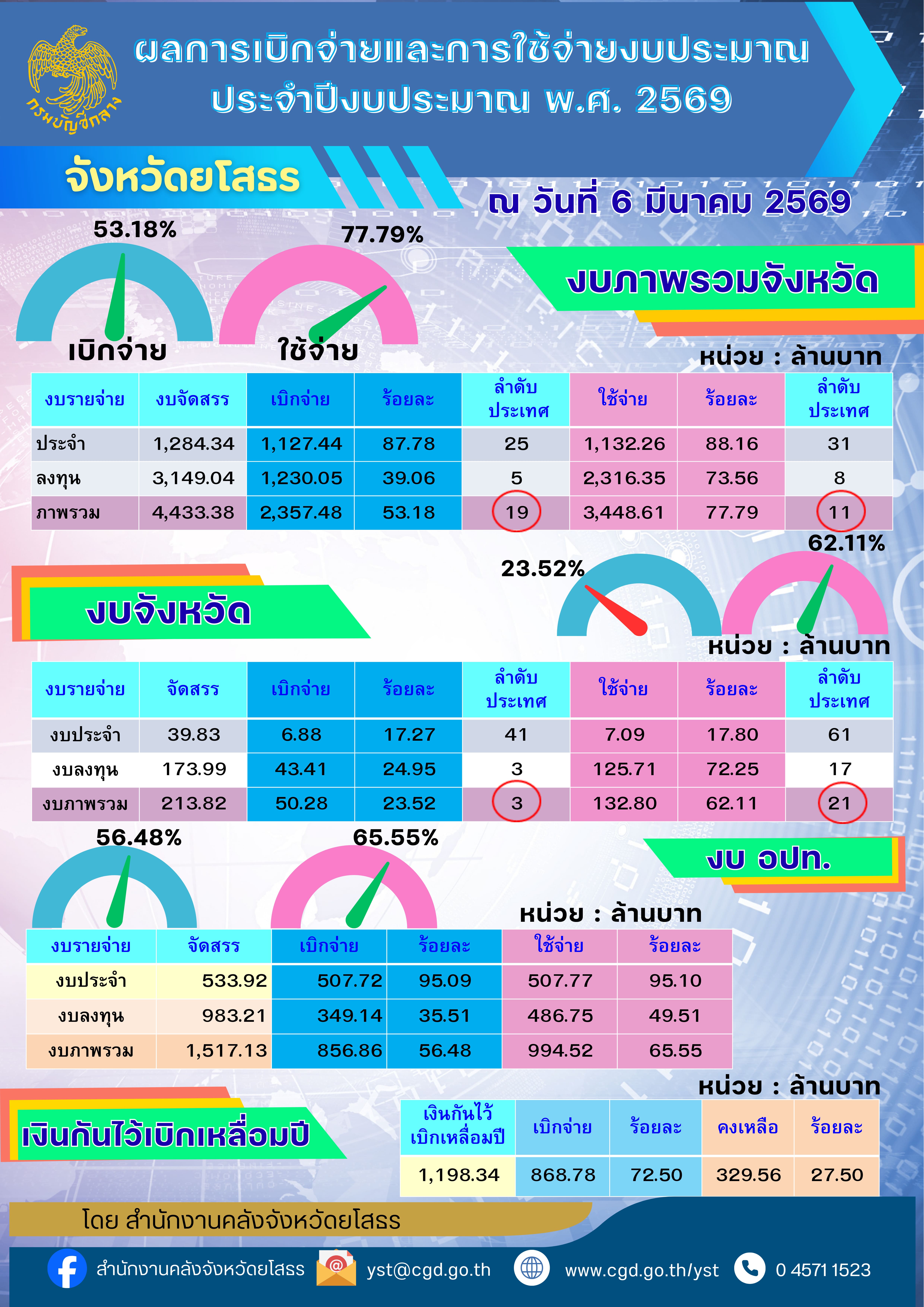 สำนักงานคลังจังหวัดยโสธร ขอรายงานผลการเบิกจ่ายและใช้จ่ายงบประมาณ ประจำปีงบประมาณ พ.ศ. 2569 จังหวัดยโสธร ณ วันที่ 6 มีนาคม 2569