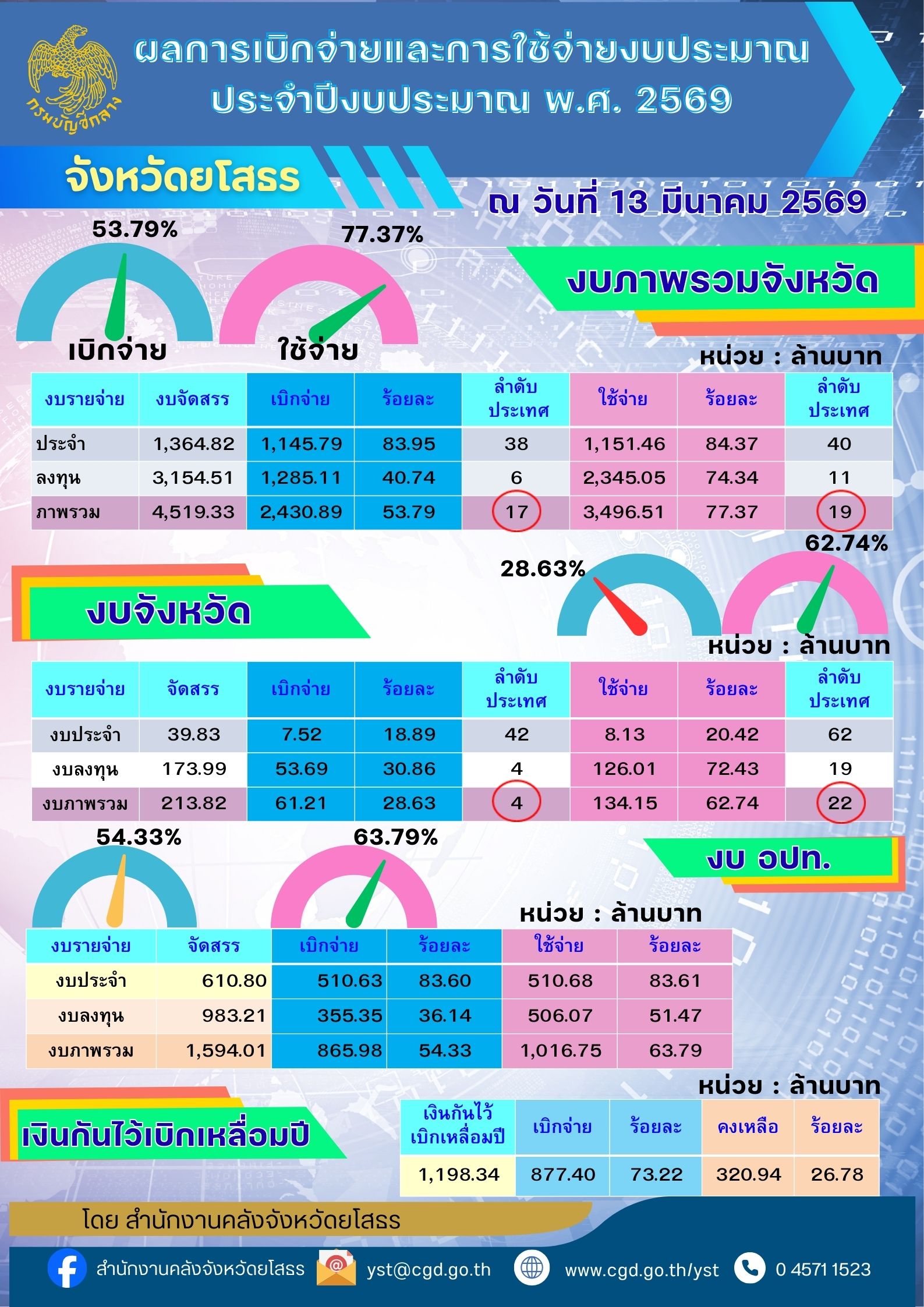 สำนักงานคลังจังหวัดยโสธร ขอรายงานผลการเบิกจ่ายและใช้จ่ายงบประมาณ ประจำปีงบประมาณ พ.ศ. 2569 จังหวัดยโสธร ณ วันที่ 13 มีนาคม 2569