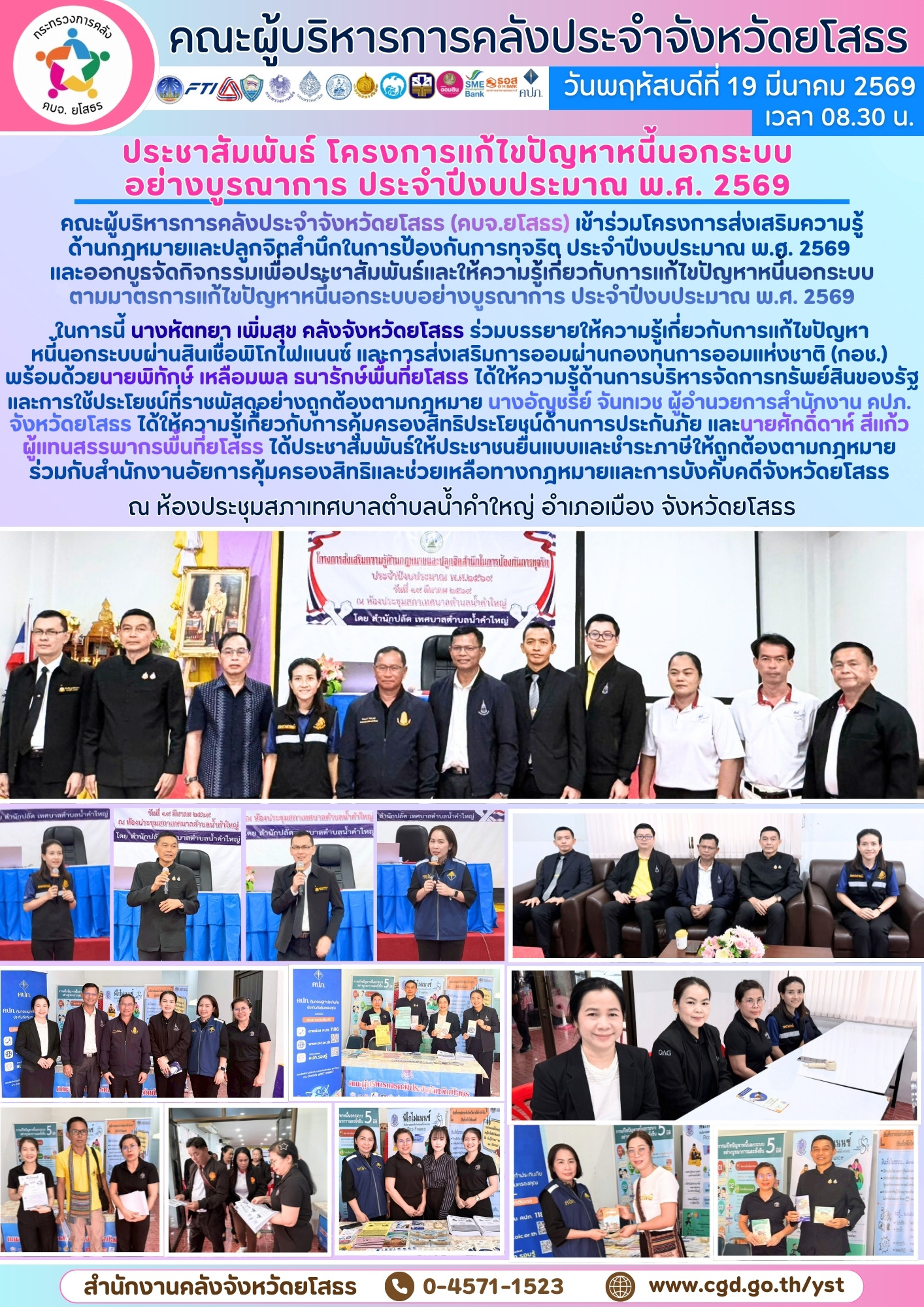 - [15:19] ทั่วไป วันพฤหัสบดีที่ 19 มีนาคม 2569 คณะผู้บริหารการคลังประจำจังหวัดยโสธร (คบจ.ยโสธร) เข้าร่วมโครงการส่งเสริมความรู้ด้านกฎหมายและปลูกจิตสำนึกในการป้องกันการทุจริต ประจำปีงบประมาณ พ.ศ. 2569 และออกบูธจัดกิจกรรมเพื่อประชาสัมพันธ์และให้ความรู้เกี่ยวกับการแก้ไขป