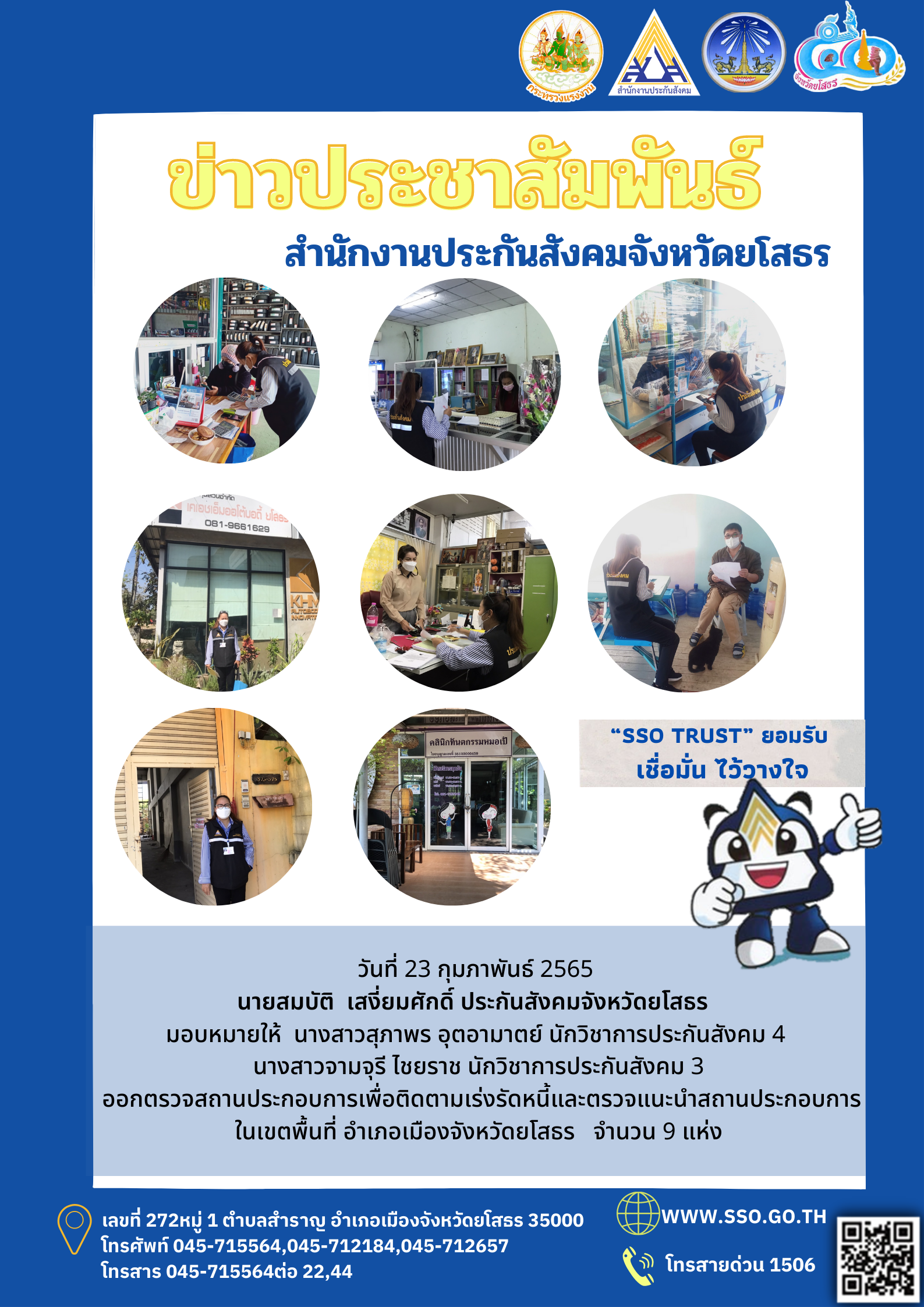 วันที่ 23 กุมภาพันธ์ 2565 นายสมบัติ เสงี่ยมศักดิ์ ประกันสังคมจังหวัดยโสธร มอบหมายให้ นางสาวสุภาพร อุตอามาตย์ นักวิชาการประกันสังคม 4 เเละ นางสาวจามจุรี ไชยราช นักวิชาการประกันสังคม 3 ออกตรวจสถานประกอบการเพื่อติดตามเร่งรัดหนี้ จำนวน 9 แห่ง