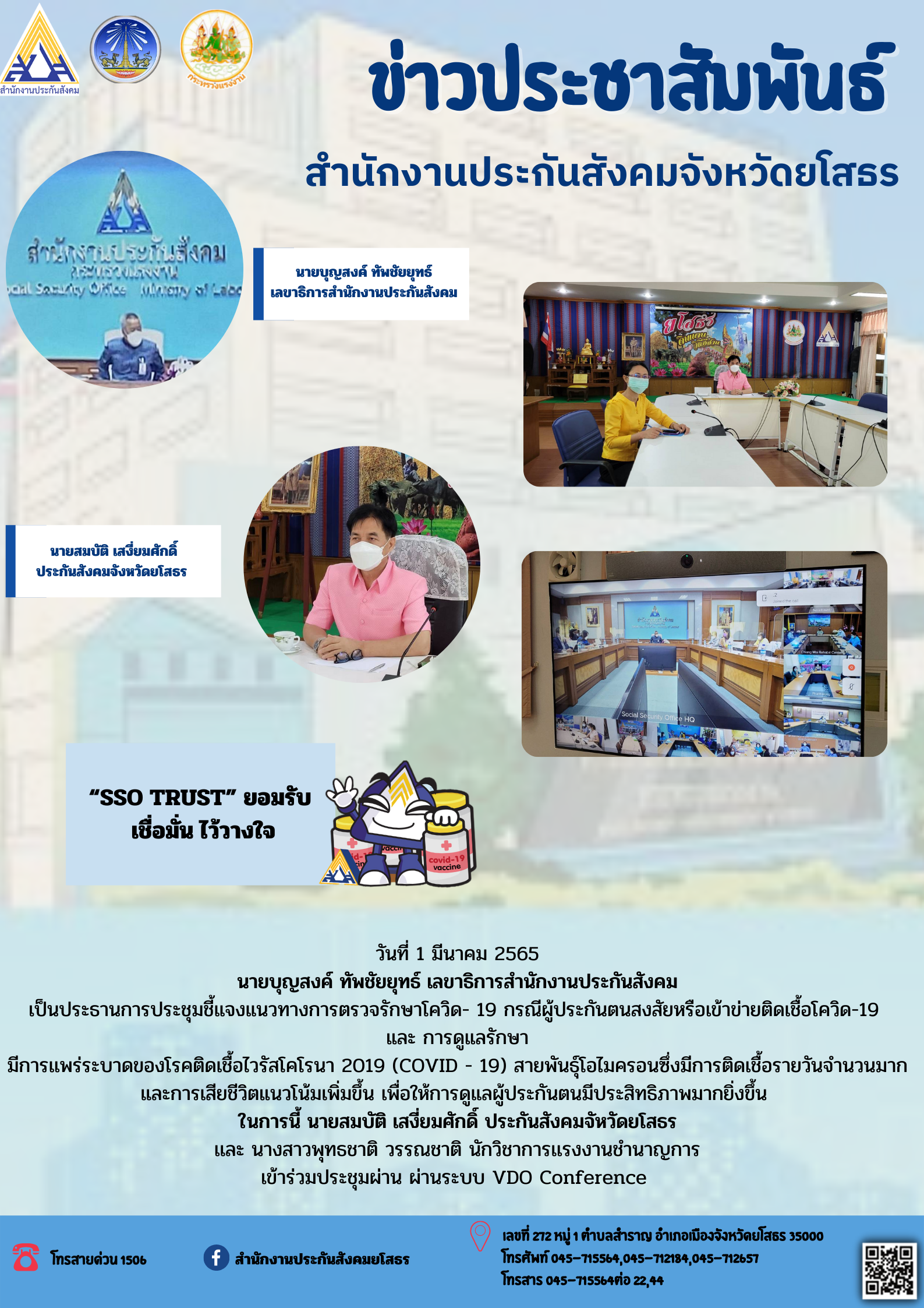 วันที่ 1 มีนาคม 2565 นายบุญสงค์ ทัพชัยยุทธ์ เลขาธิการสำนักงานประกันสังคม เป็นประธานการประชุมชี้แจงแนวทางการตรวจรักษาโควิด- 19 กรณีผู้ประกันตนสงสัยหรือเข้าข่ายติดเชื้อโควิด-19 และ การดูแลรักษา มีการเเพร่ระบาดของโรคติดเชื้อไวรัสโคโรนา 2019 (COVID - 19)