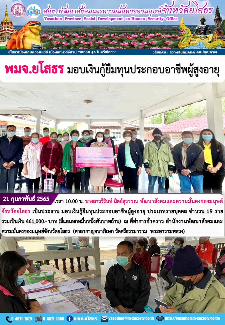 พมจ.ยโสธร มอบเงินกู้ยืมทุนประกอบอาชีพผู้สูงอายุ (21 กุมภาพันธ์ 2565)