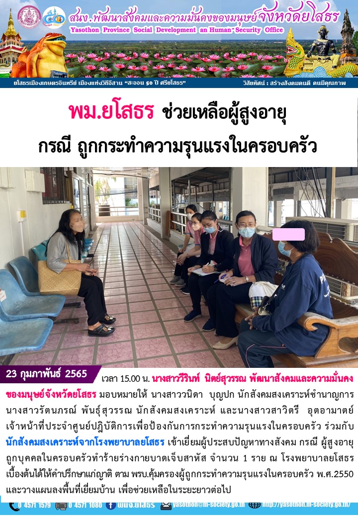 พม.ยโสธร ช่วยเหลือผู้สูงอายุ กรณี ถูกกระทำความรุนแรงในครอบครัว (23 กุมภาพันธ์ 2565)