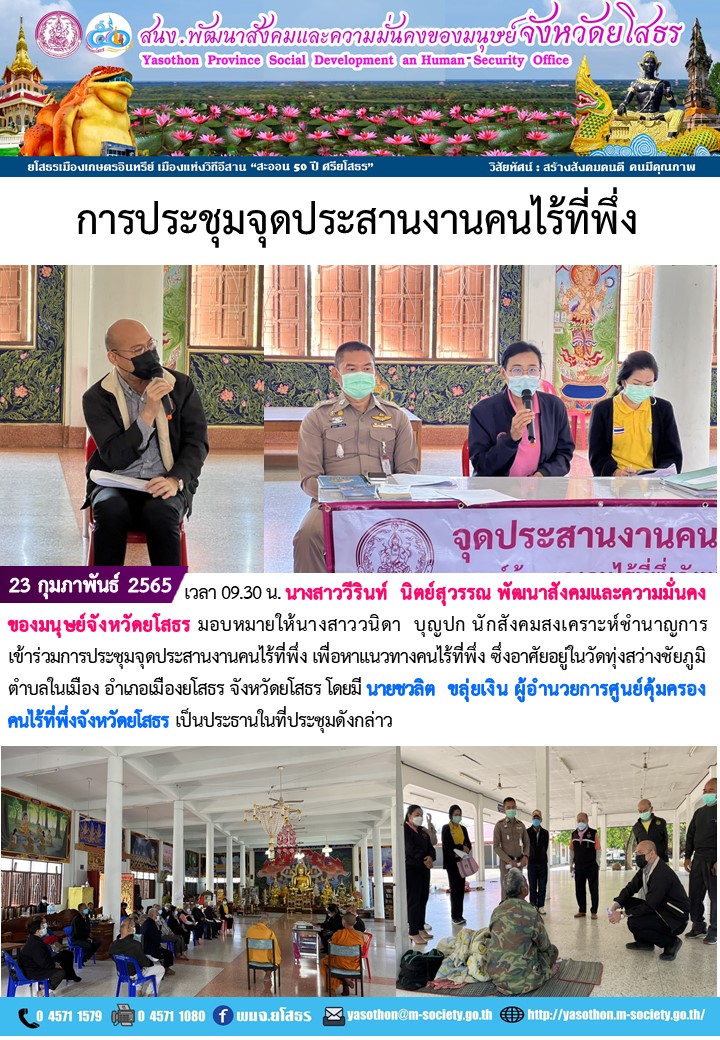 วันที่ 1 มี.ค. 2565 (21:53 น.)วันที่ 23 กุมภาพันธ์ 2565 เวลา 09.30 น. นางสาววีรินท์ นิตย์สุวรรณ พัฒนาสังคมและความมั่นคงของมนุษย์จังหวัดยโสธร มอบหมายให้นางสาววนิดา บุญปก นักสังคมสงเคราะห์ชำนาญการ เข้าร่วมการประชุมจุดประสานงานคนไร้ที่พึ่ง เพื่อหาแนวทางคนไร้ที่พึ่ง ซึ่งอาศัยอยู่ในวัดทุ่งสว่างชัยภูมิ ตำบลในเมือง อำเภอเมืองยโสธร จังหวัดยโสธร โดยมีนายชวลิต ขลุ่ยเงิน เป็นประธานในที่ประชุมดังกล่าว