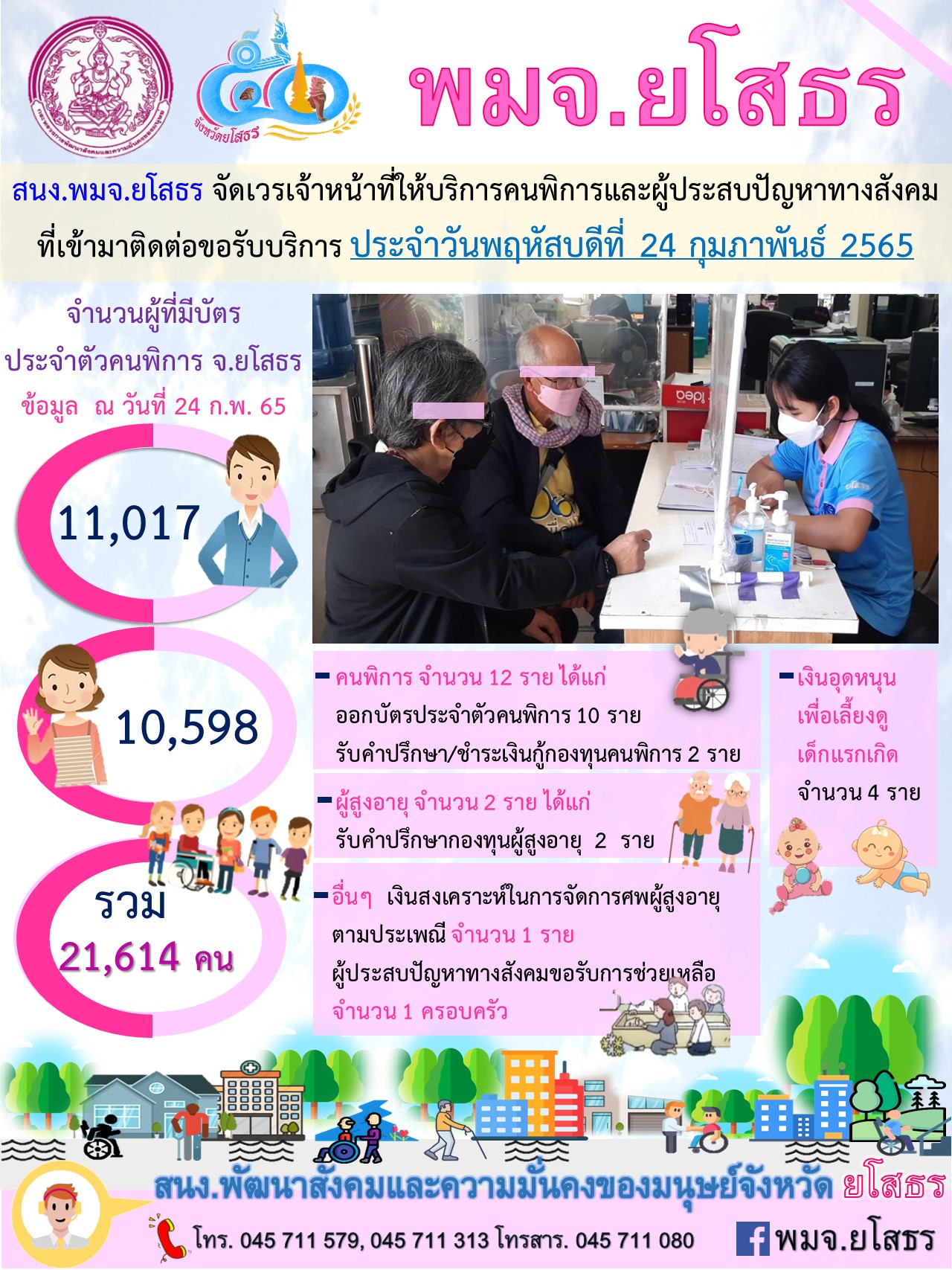 สนง.พมจ.ยโสธร จัดเวรเจ้าหน้าที่ให้บริการคนพิการและผู้ประสบปัญหาทางสังคม ที่เข้ามาติดต่อขอรับบริการ (24 กุมภาพันธ์ 2565)
