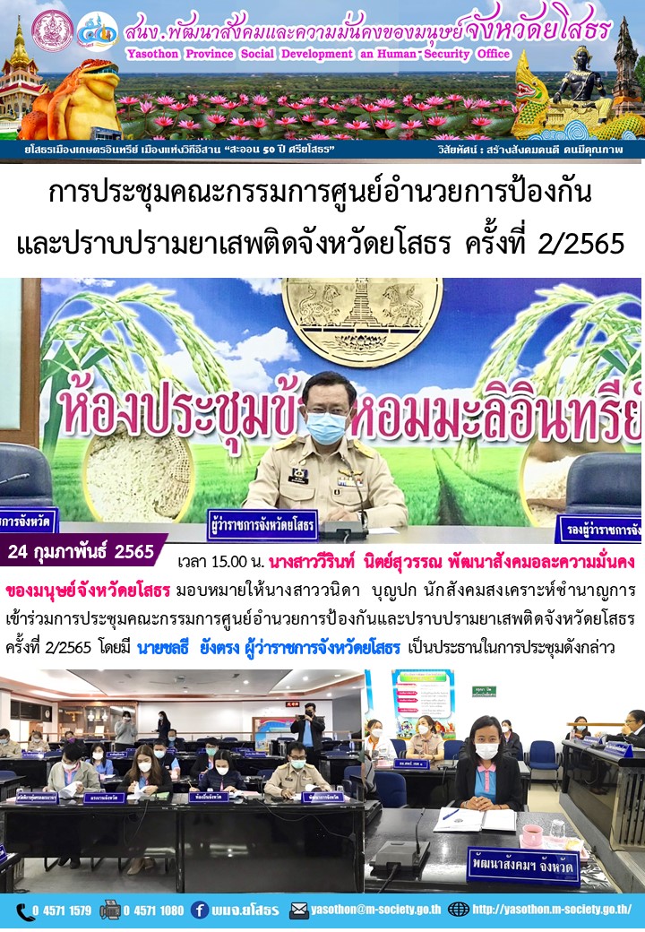 วันที่ 1 มี.ค. 2565 (22:00 น.)วันที่ 24 กุมภาพันธ์ 2565 เวลา 15.00 น. นางสาววีรินท์ นิตย์สุวรรณ พัฒนาสังคมอละความมั่นคงของมนุษย์จังหวัดยโสธร มอบหมายให้นางสาววนิดา บุญปก นักสังคมสงเคราะห์ชำนาญการ เข้าร่วมการประชุมคณะกรรมการศูนย์อำนวยการป้องกันและปราบปรามยาเสพติดจังหวัดยโสธร ครั้งที่ 2/2565 โดยมี นายชลธี ยังตรง ผู้ว่าราชการจังหวัดยโสธร เป็นประธานในการประชุมดังกล่าว