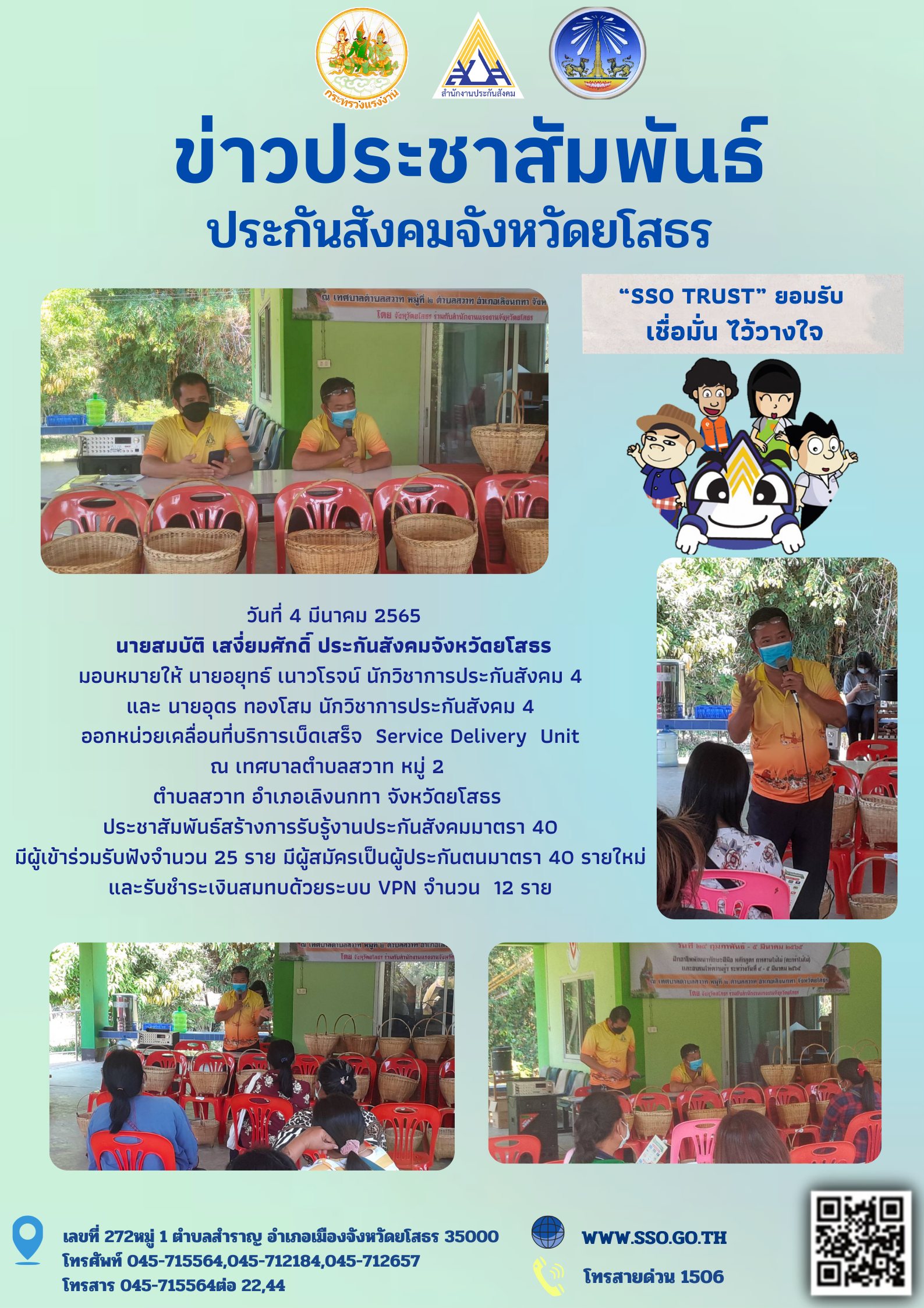 วันที่ 4 มีนาคม 2565 นายสมบัติ เสงี่ยมศักดิ์ ประกันสังคมจังหวัดยโสธร มอบหมายให้ นายอยุทธ์ เนาวโรจน์ นักวิชาการประกันสังคม 4 และ นายอุดร ทองโสม นักวิชาการประกันสังคม 4 ออกหน่วยเคลื่อนที่บริการเบ็ดเสร็จ SERVICE DELIVERY UNIT
