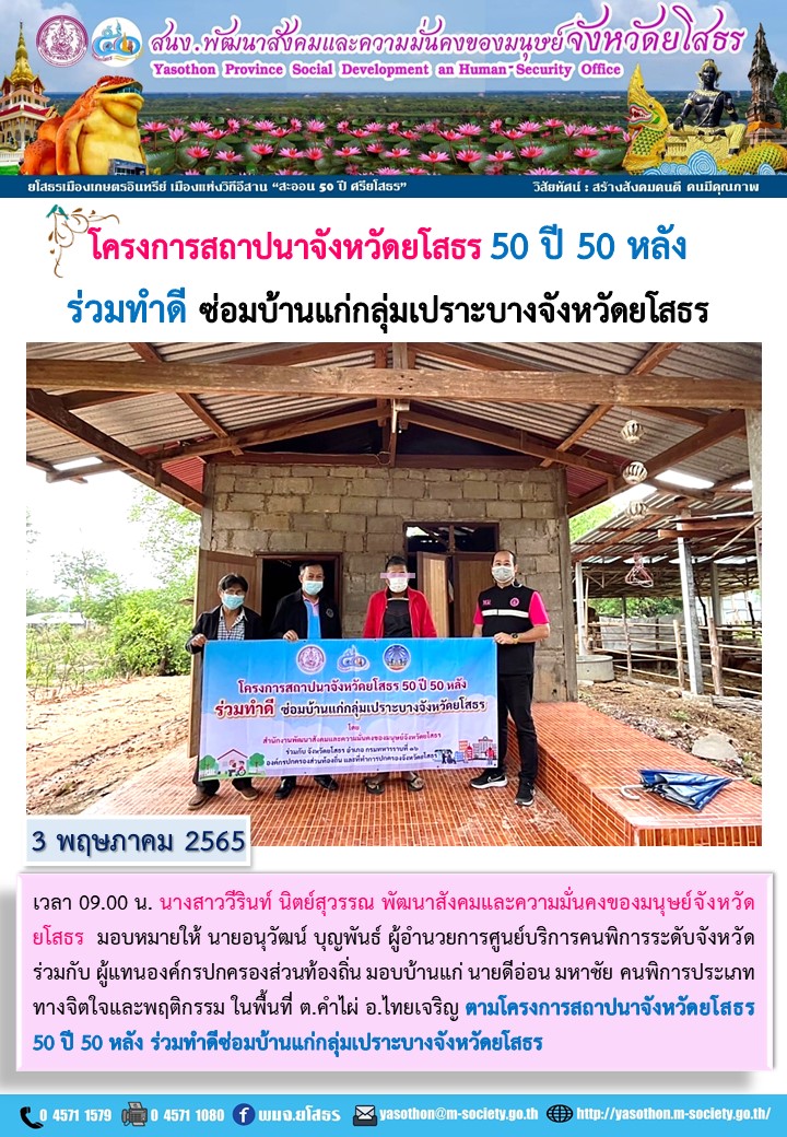 โครงการสถาปนาจังหวัดยโสธร 50 ปี 50 หลัง ร่วมทำดี ซ่อมบ้านแก่กลุ่มเปราะบางจังหวัดยโสธร (คนพิการประเภทจิตใจและพฤติกรรม) (3 พฤษภาคม 2565)