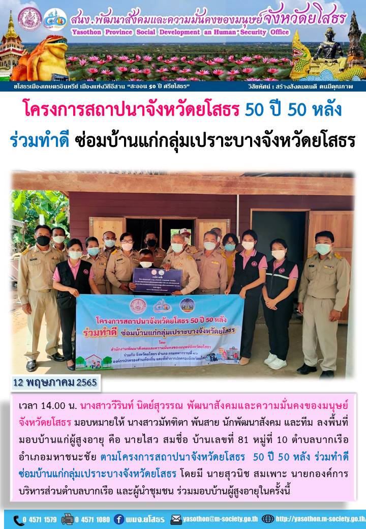 โครงการสถาปนาจังหวัดยโสธร 50 ปี 50 หลัง ร่วมทำดี ซ่อมบ้านแก่กลุ่มเปราะบางจังหวัดยโสธร (12 พฤษภาคม 2565)