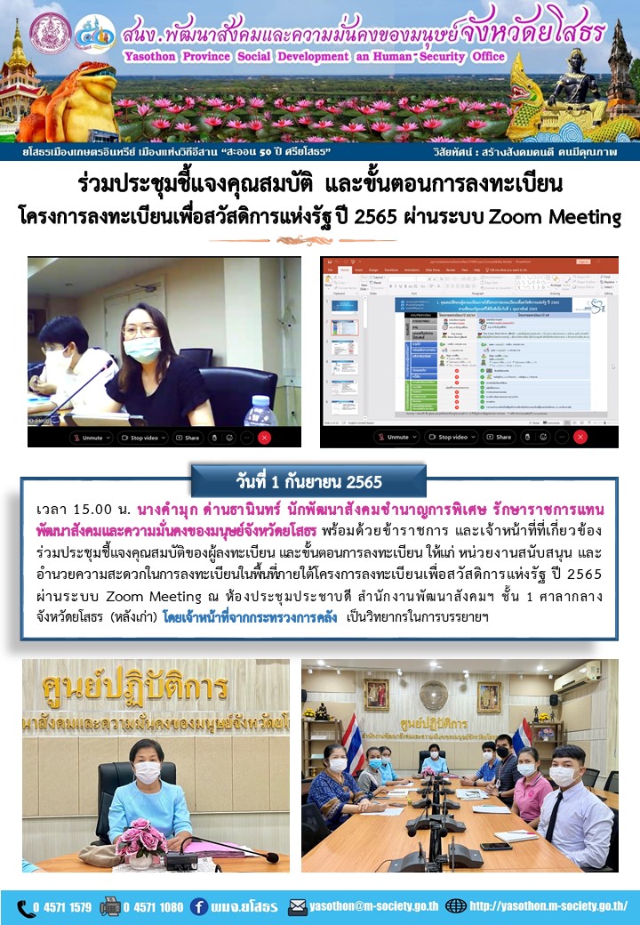 วันที่ 16 ก.ย. 2565 (10:54 น.)วันที่ 1 กันยายน 2565 เวลา 15.00 น. นางคำมุก ด่านธานินทร์ นักพัฒนาสังคมชำนาญการพิเศษ รักษาราชการแทนพัฒณาสังคมและความมั่นคงของมนุษย์จังหวัดยโสธร พร้อมด้วยข้าราชการ และเจ้าหน้าที่ที่เกี่ยวข้อง ร่วมประชุมชี้แจงคุณสมบัติของผู้ลงทะเบียน และขั้นตอนการลงทะเบียน ให้แก่ หน่วยงานสนับสนุน และอำนวยความสะดวกในการลงทะเบียนในพื้นที่ายใต้โครงการลงทะเบียนเพื่อสวัสดิการแห่งรัฐ ปี 2565 ผ่านระบบ Zoom Meeting ณ ห้องประชุมประชาบดี สำนักงานพัฒนาสังคมฯ ชั้น 1 ศาลากลางจังหวัดยโสธร (หลังเก่า) โดยเจ้าหน้าที่จากกระทรวงการคลัง เป็นวิทยากรในการบรรยายฯ