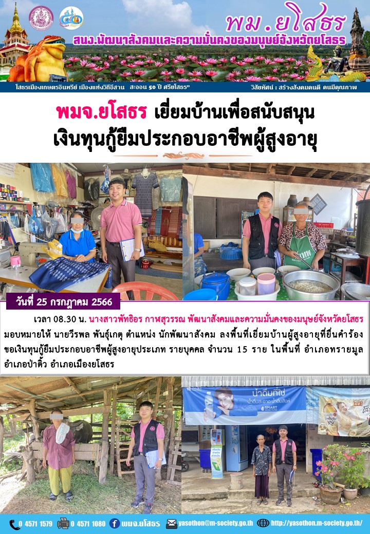 พมจ.ยโสธร เยี่ยมบ้านเพื่อสนับสนุนเงินทุนกู้ยืมประกอบอาชีพผู้สูงอายุ (25 กรกฎาคม 2566)