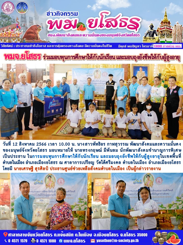 พมจ.ยโสธร มอบทุนการศึกษาให้กับนักเรียน และมอบถุงยังชีพให้กับผู้สูงอายุ (12 สิงหาคม 2566)