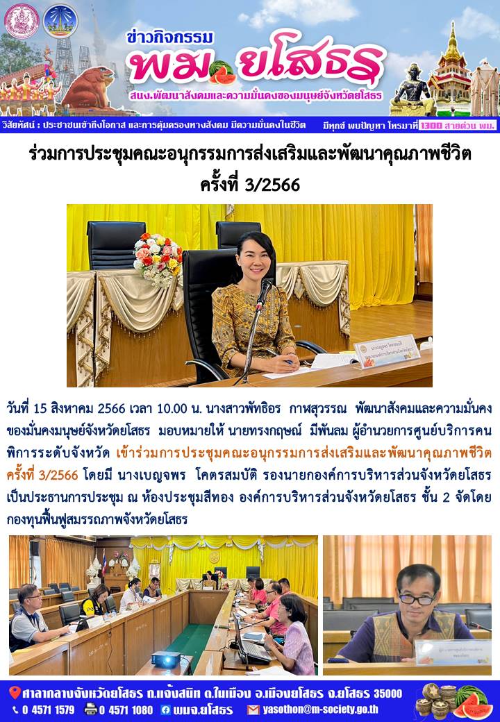 วันที่ 26 ส.ค. 2566 (22:07 น.)วันที่ 15 สิงหาคม 2566 เวลา 10.00 น. นางสาวพัทธิอร กาฬสุวรรณ พัฒนาสังคมและความมั่นคงของมั่นคงมนุษย์จังหวัดยโสธร มอบหมายให้ นายทรงกฤษณ์ มีพันลม ผู้อำนวยการศูนย์บริการคนพิการระดับจังหวัด เข้าร่วมการประชุมคณะอนุกรรมการส่งเสริมและพัฒนาคุณภาพชีวิต ครั้งที่ 3/2566 โดยมี นางเบญจพร โคตรสมบัติ รองนายกองค์การบริหารส่วนจังหวัดยโสธร เป็นประธานการประชุม ณ ห้องประชุมสีทอง องค์การบริหารส่วนจังหวัดยโสธร ชั้น 2 จัดโดย กองทุนฟื้นฟูสมรรถภาพจังหวัดยโสธร ศาลากลางจังหวัดยโสรร ก.แจ้งสนิท ต.ในเนือง จ.เมืองยโสรร