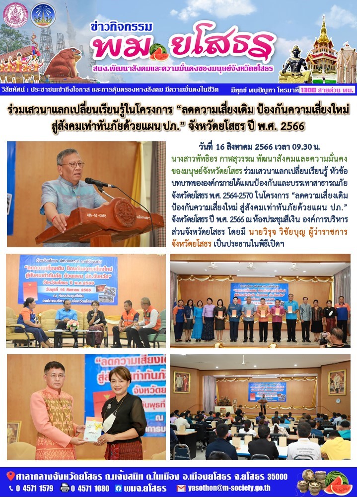 วันที่ 26 ส.ค. 2566 (22:24 น.)วันที่ 16 สิงหาคม 2566 เวลา 09.30 น. นางสาวพัทธิอร กาฬสุวรรณ พัฒนาสังคมและความมั่นคงของมนุษย์จังหวัดยโสธร ร่วมเสวนาแลกเปลี่ยนเรียนรู้ หัวข้อบทบาทขององค์กภายใต้แผนป้องกันและบรรเทาสาธารณภัยจังหวัดยโสธร พศ. 2564-2570 ในโครงการ "ลดความเสี่ยงเติมป้องกันความเสี่ยงใหม่ สู่สังคมเท่าทันภัยด้วยแผน ปภ."จังหวัดยโสธร ปี ทศ. 2566 ณห้องประชุมสีเงิน องค์การบริหารส่วนจังหวัดยโสธร โดยมี นายวิรุจ วิชัยบุญ ผู้ว่าราชการจังหวัดยโสธร เป็นประธานในพิธีเปิดฯ