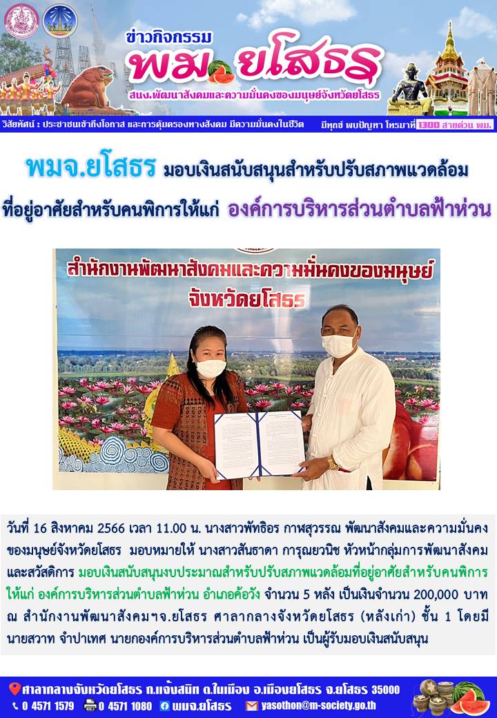 วันที่ 26 ส.ค. 2566 (22:29 น.)วันที่ 16 สิงหาคม 2566 เวลา 11.00 น. นางสาวพัทธิอร กาฬสุวรรณ พัฒนาสังคมและความมั่นคงของมนุษย์จังหวัดยโสธร มอบหมายให้ นางสาวสันธาดา การุณยวนิช หัวหน้ากลุ่มการพัฒนาสังคมและสวัสดิการ มอบเงินสนับสนุนงบประมาณสำหรับปรับสภาพแวดล้อมที่อยู่อาศัยสำหรับคนพิการให้แก่ องค์การบริหารส่วนตำบลฟ้าห่วน อำเภอค้อวัง จำนวน 5 หลัง เป็นเงินจำนวน 200,000 บาท ณ สำนักงานพัฒนาสังคมฯจ.ยโสธร ศาลากลางจังหวัดยโสธร (หลังเก่า) ชั้น 1 โดยมี นายสวาท จำปาเทศ นายกองค์การบริหารส่วนตำบลฟ้าห่วน เป็นผู้รับมอบเงินสนับสนุน