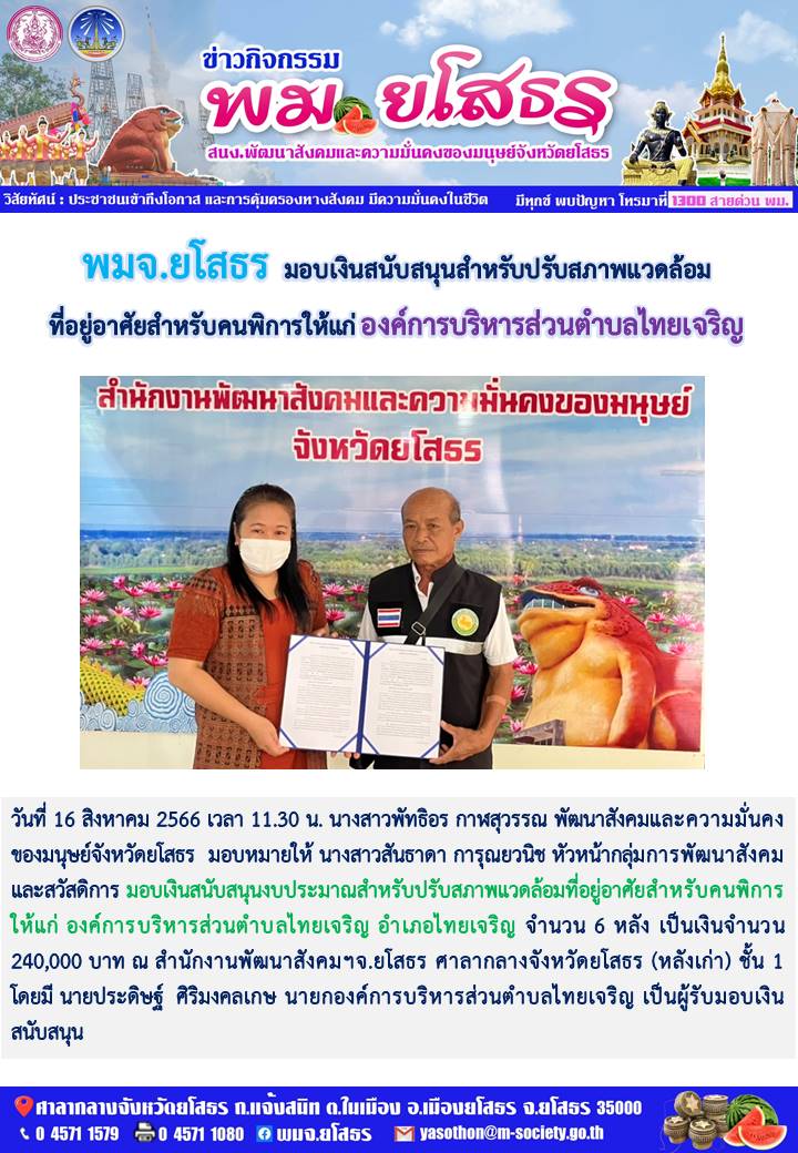 พมจ.ยโสธร มอบเงินสนับสนุนงบประมาณสำหรับปรับสภาพแวดล้อมที่อยู่อาศัยสำหรับคนพิการให้แก่ องค์การบริหารส่วนตำบลไทยเจริญ (16 สิงหาคม 2566)