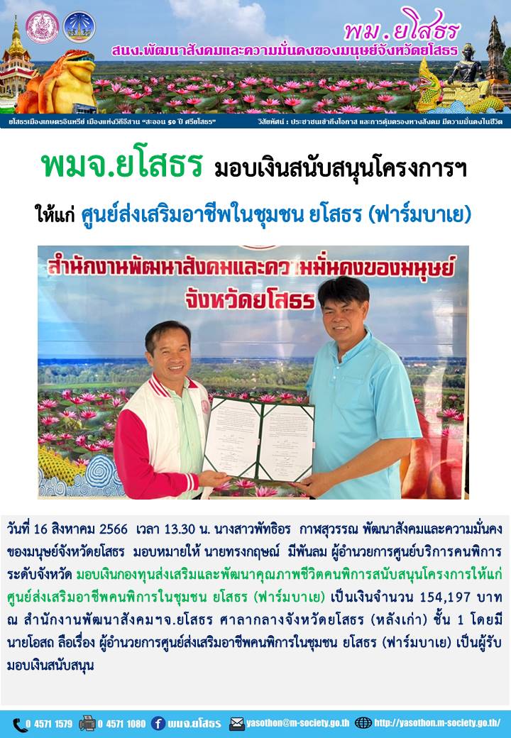 พมจ.ยโสธร มอบเงินกองทุนส่งเสริมและพัฒนาคุณภาพชีวิตคนพิการสนับสนุนโครงการให้แก่ ศูนย์ส่งเสริมอาชีพคนพิการในชุมชน ยโสธร (ฟาร์มบาเย) (16 สิงหาคม 2566)