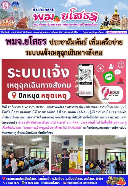 วันที่ 26 ส.ค. 2566 (22:42 น.)วันที่ 17 สิงหาคม 2566 เวลา 10.30 น. นางสาวพัทธิอร กาฬสุวรรณ พัฒนาสังคมและความมั่นคงของมนุษย์จังหวัดยโสธร มอบหมายให้ นางสาวกิติยา ศิริโสดา นักพัฒนาสังคมปฏิบัติการ นายไชยพร ทองทั่ว นักพัฒนาสังคม และนางสาวสาวิตรี อุตอามาตย์ จนท.ประจำศูนย์ปฏิบัติการเพื่อป้องกันการกระทำความรุนแรงในครอบครัว ประชาสัมพันธ์และเชิญชวนให้ คณะทำงาน ศพค. ประชาชนทั่วไป ในพื้นที่ตำบลหนองคู เพิ่มเพื่อนใน Line “ระบบการแจ้งเหตุฉุกเฉินทางสังคม ESS THAILAND” ณ ห้องประชุมสภาองค์การบริหารส่วนตำบลหนองคู อำเภอเมืองยโสธร จังหวัดยโสธร