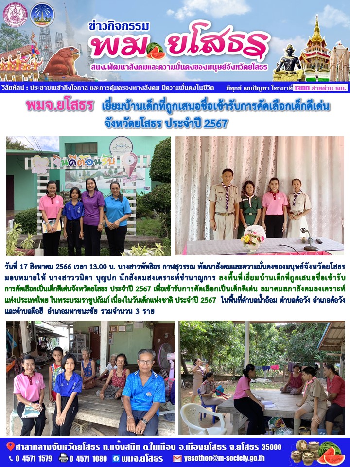 พมจต.ยโสธร ลงพื้นที่เยี่ยมบ้านเด็กที่ถูกเสนอชื่อเข้ารับ การคัดเลือกเป็นเด็กดีเด่นจังหวัดยโสธร ประจำปี 2567 (17 สิงหาคม 2566)