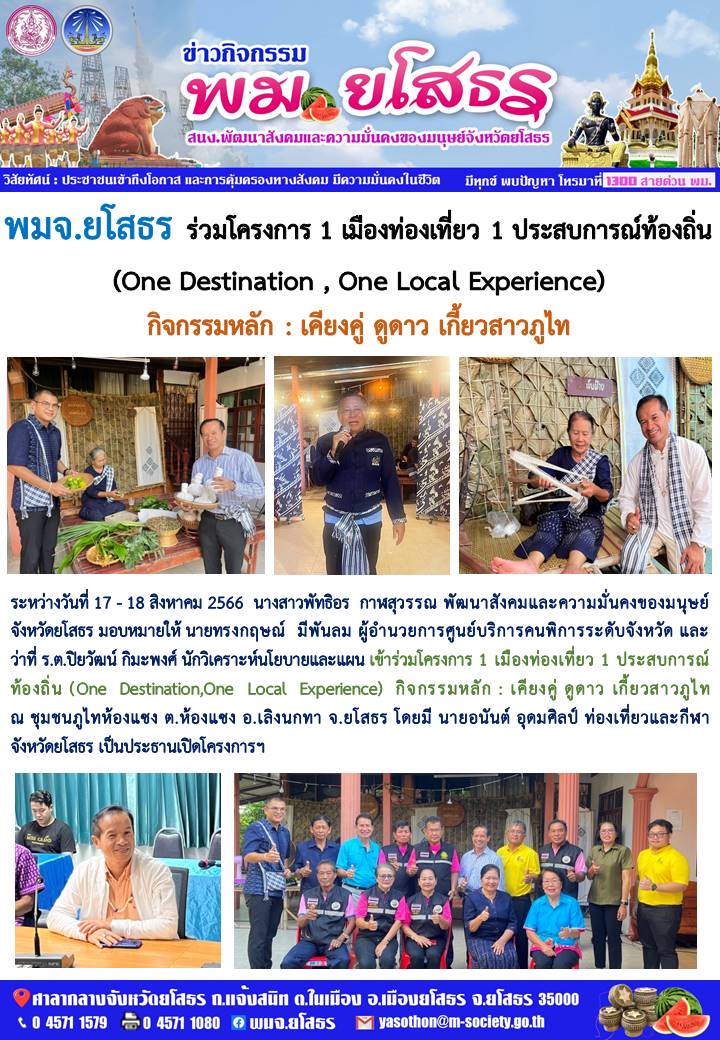 วันที่ 26 ส.ค. 2566 (23:01 น.)ระหว่างวันที่ 17 - 18 สิงหาคม 2566 นางสาวพัทธิอร กาฬสุวรรณ พัฒนาสังคมและความมั่นคงของมนุษย์จังหวัดยโสธร มอบหมายให้ นายทรงกฤษณ์ มีพันลม ผู้อำนวยการศูนย์บริการคนพิการระดับจังหวัด และ ว่าที่ ร.ต.ปิยวัฒน์ กิมะพงศ์ นักวิเคราะห์นโยบายและแผน เข้าร่วมโครงการ 1 เมืองท่องเที่ยว 1 ประสบการณ์ท้องถิ่น (One Destination,One Local Experience) กิจกรรมหลัก : เคียงคู่ ดูดาว เกี้ยวสาวภูไท ณ ชุมชนภูไทห้องแซง ต.ห้องแซง อ.เลิงนกทา จ.ยโสธร โดยมี นายอนันต์ อุดมศิลป์ ท่องเที่ยวและกีฬา จังหวัดยโสธร เป็นประธานเปิดโครงการฯ