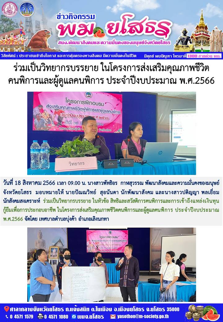 วันที่ 26 ส.ค. 2566 (23:05 น.)วันที่ 18 สิงหาคม 2566 เวลา 09.00 น. นางสาวพัทธิอร กาฬสุวรรณ พัฒนาสังคมและความมั่นคงของมนุษย์จังหวัดยโสธร มอบหมายให้ นายปัณณวิทย์ สุอนันตา นักพัฒนาสังคม และนางสาวปติญญา พลเยี่ยม นักสังคมสงเคราะห์ ร่วมเป็นวิทยากรบรรยาย ในหัวข้อ สิทธิและสวัสดิการคนพิการและการเข้าถึงแหล่งเงินทุนกู้ยืมเพื่อการประกอบอาชีพ ในโครงการส่งเสริมคุณภาพชีวิตคนพิการและผู้ดูแลคนพิการ ประจำปีงบประมาณ พ.ศ.2566 จัดโดย เทศบาลตำบลบุ่งค้า อำเภอเลิงนกทา