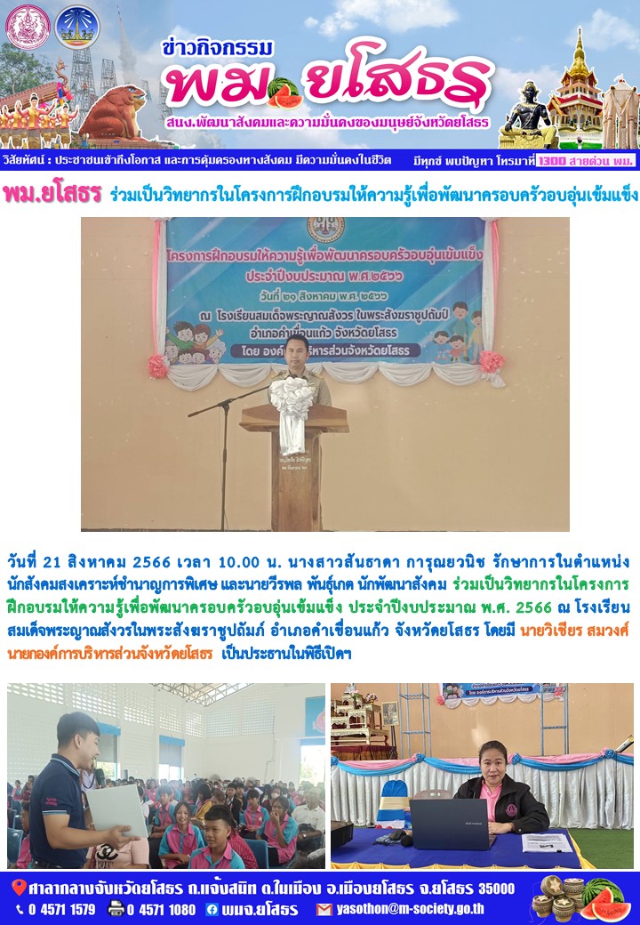 วันที่ 26 ส.ค. 2566 (23:16 น.)วันที่ 21 สิงหาคม 2566 เวลา 10.00 น. นางสาวสันธาดา การุณยวนิช รักษาการในตำแหน่ง นักสังคมสงเคราะห์ชำนาญการพิเศษ และนายวีรพล พันธุ์เกต นักพัฒนาสังคม ร่วมเป็นวิทยากรในโครงการฝึกอบรมให้ความรู้เพื่อพัฒนาครอบครัวอบอุ่นเข้มแข็ง ประจำปีงบประมาณ พ.ศ. 2566 ณ โรงเรียน สมเด็จพระญาณสังวรในพระสังฆราชูปถัมภ์ อำเภอคำเขื่อนแก้ว จังหวัดยโสธร โดยมี นายวิเชียร สมวงศ์ นายกองค์การบริหารส่วนจังหวัดยโสธร เป็นประธานในพิธีเปิดฯ