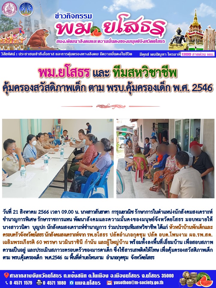 พมจ.ยโสธร ลงพื้นที่เยี่ยมบ้าน เพื่อสอบสภาพ ความเป็นอยู่ และประเมินสภาวะครอบครัวของมารดาเด็ก ซึ่งใช้สารเสพติดให้โทษ (21 สิงหาคม 2566)