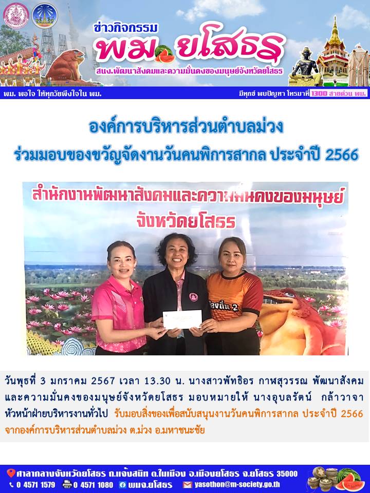 วันที่ 21 ก.พ. 2567 (11:38 น.)วันพุธที่ 3 มกราคม 2567 เวลา 13.30 น. นางสาวพัทธิอร กาฬสุวรรณ พัฒนาสังคมและความมั่นคงของมนุษย์จังหวัดยโสธร มอบหมายให้ นางอุบลรัตน์ กล้าวาจา หัวหน้าฝ่ายบริหารงานทั่วไป รับมอบสิ่งของเพื่อสนับสนุนงานวันคนพิการสากล ประจำปี 2566 จากองค์การบริหารส่วนตำบลม่วง ต.ม่วง อ.มหาชนะชัย