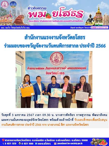 วันที่ 21 ก.พ. 2567 (11:40 น.)วันพุธที่ 3 มกราคม 2567 เวลา 09.30 น. นางสาวพัทธิอร กาฬสุวรรณ พัฒนาสังคมและความมั่นคงของมนุษย์จังหวัดยโสธร พร้อมด้วยเจ้าหน้าที่ รับมอบสิ่งของเพื่อสนับสนุนงานวันคนพิการสากล ประจำปี 2566 จาก นางอาภรณ์ สีสา แรงงานจังหวัดยโสธร